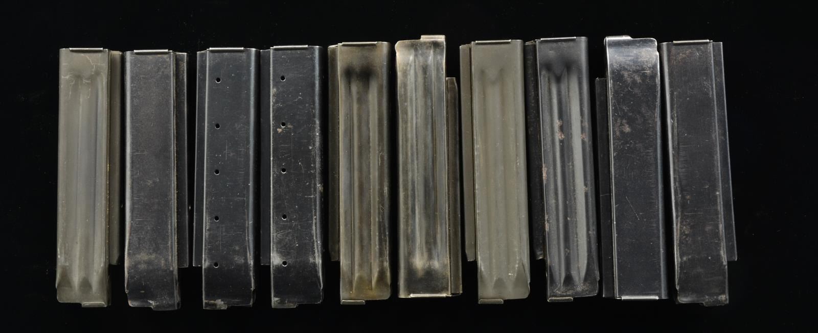 8 Blued mags.: 5- 20 rds. & 3-12 rds., remaining 2-12 rd. mags. are parkerized. All are used, though none appear to have seen excessive duty. Stampings are clear as well as easy to read on blue variants, while the thickness of the parkerizing covers factory markings more. (02-13776-14/JZ). NONGUN. $200-500.