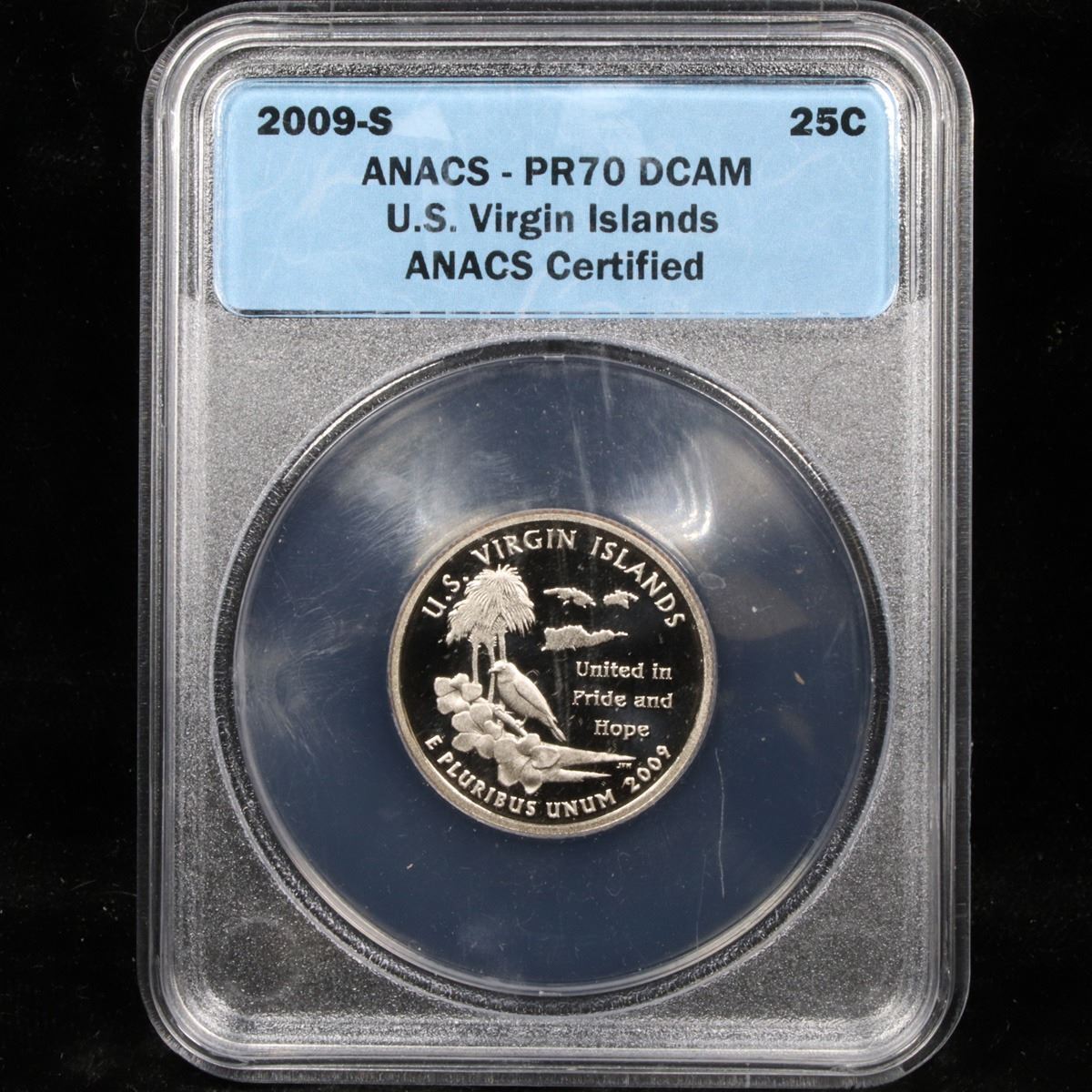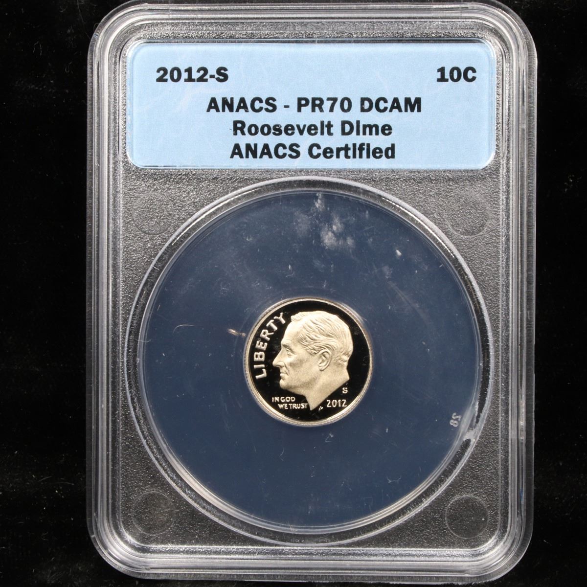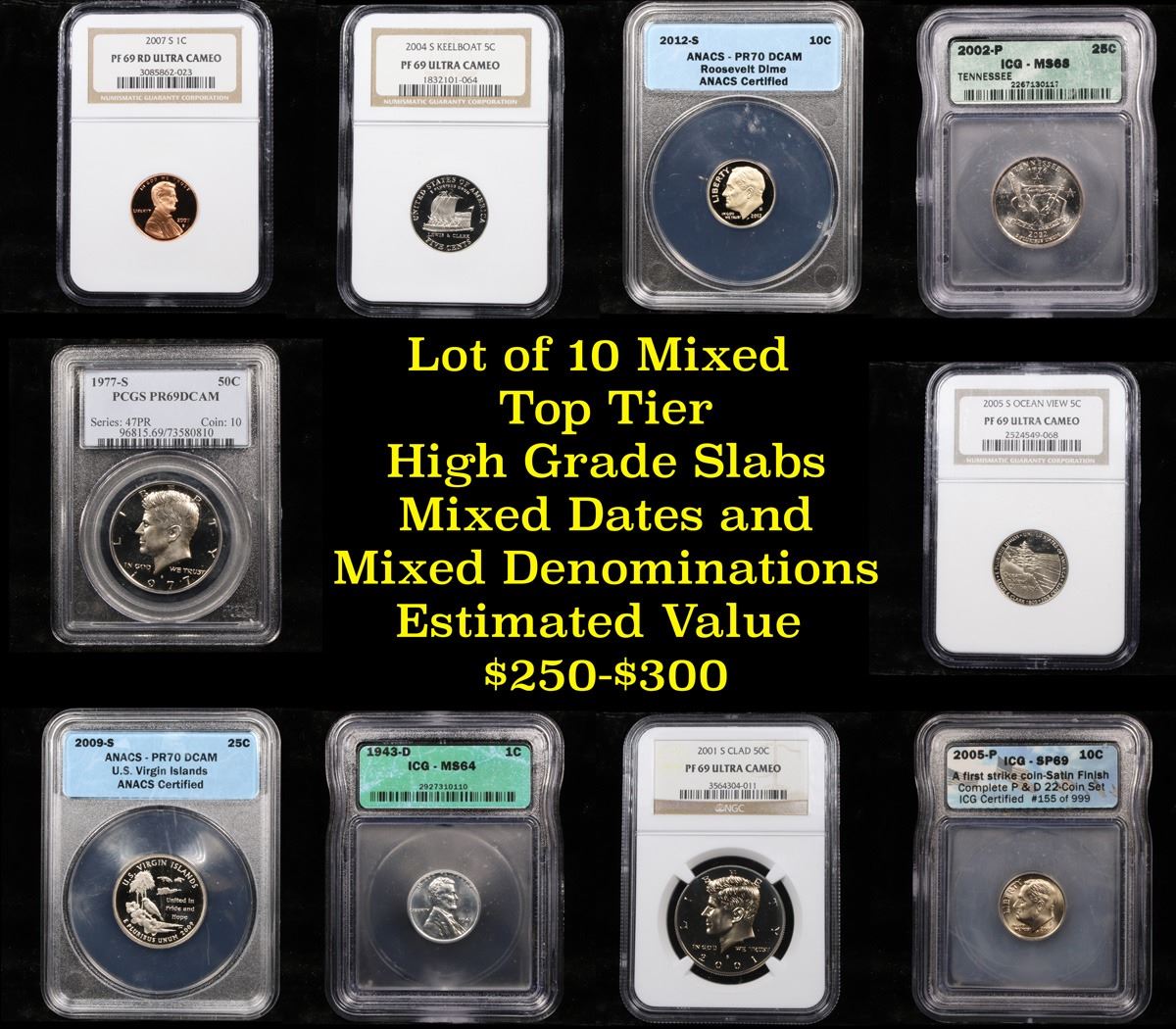 10 High Graded Top Tier Slabed Coins . 2005-s 5c Pf69 Ultra Cameo By NGC, 2001-s Clad 50c Pf69 Ultra Cameo By NGC, 2009-s 25c PR70 DCAM By ANACS, 2005-p 10c SP69 By ICG, 1977-s 50c PR69 DCAM by PCGS, 1943-d 1c ms64 By ICG, 2002-p 25c ms68 By ICG, 2012-s 10c pr70 DCAM By ANACS, 2004-s Keelboat 5c PF69 Ultra Cameo By NGC, 2007-s 1c PF69 Rd Ultra Cameo By NGC. Estimate $250-$300 ****Please Note you will Revieve exact slabs pictured in lot