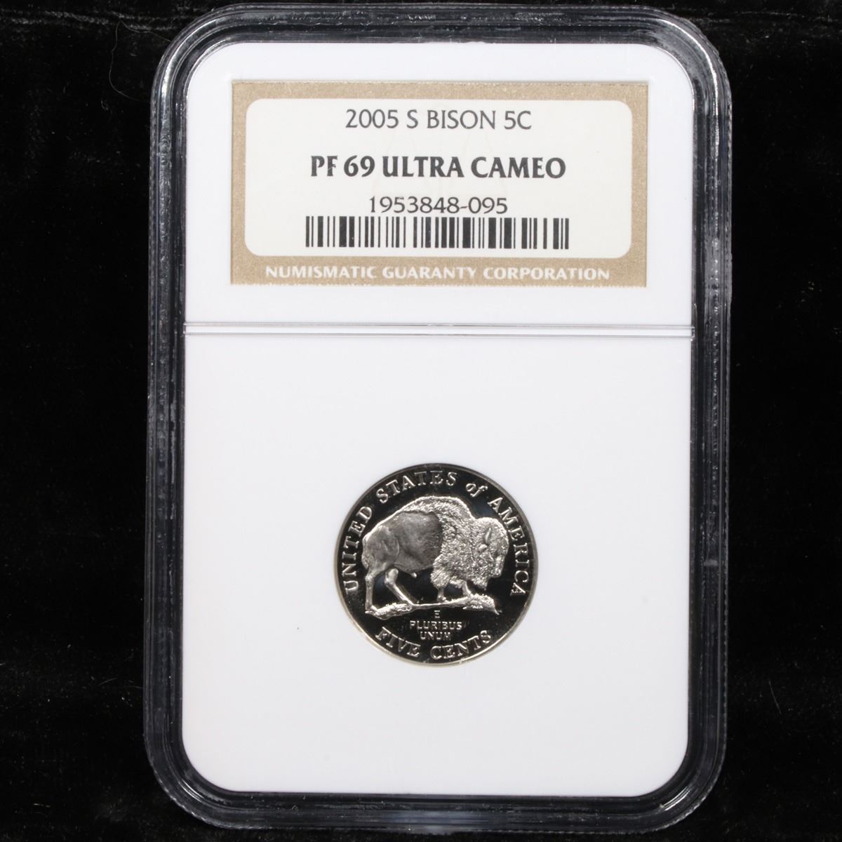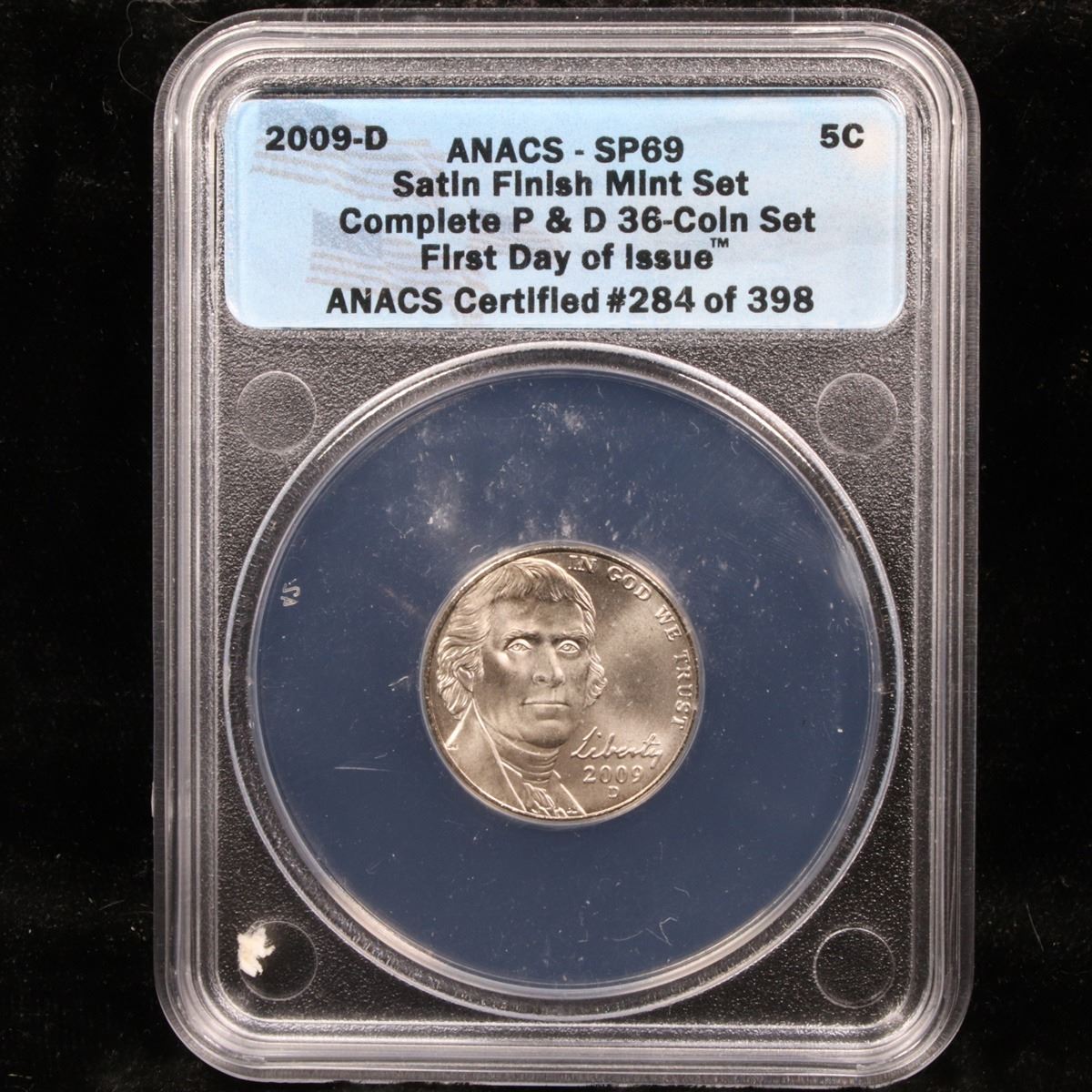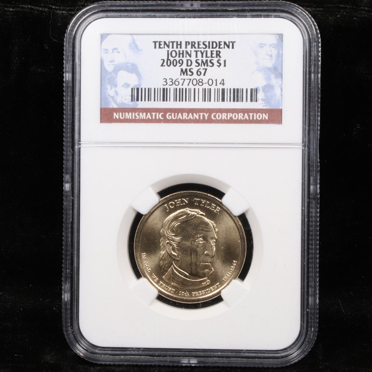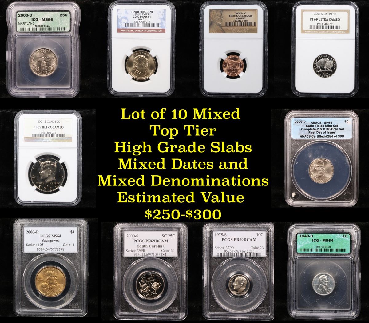 10 High Graded Top Tier Slabed Coins . 2009-d John Tyler SMS $1 ms67 By NGC, 2009-d 1c Birth and childhood ms66rd By NGC, 2005-s Bison 5c pf69 Ultra Cameo By NGC, 2001-s Clad 50c pf69 Ultra Cameo By NGC, 2000-p $1 Ms64 By PCGS, 2009-d 5c SP69 By ANACS, 2000-s 25c South Carolina pr69DCAM By PCGS, 1975-s 10c PR69DCAM By PCGS, 1943-d 1c ms64 By ICG, 2000-d 25c Maryland ms66 By ICG Estimate $250-$300 ****Please Note you will Revieve exact slabs pictured in lot