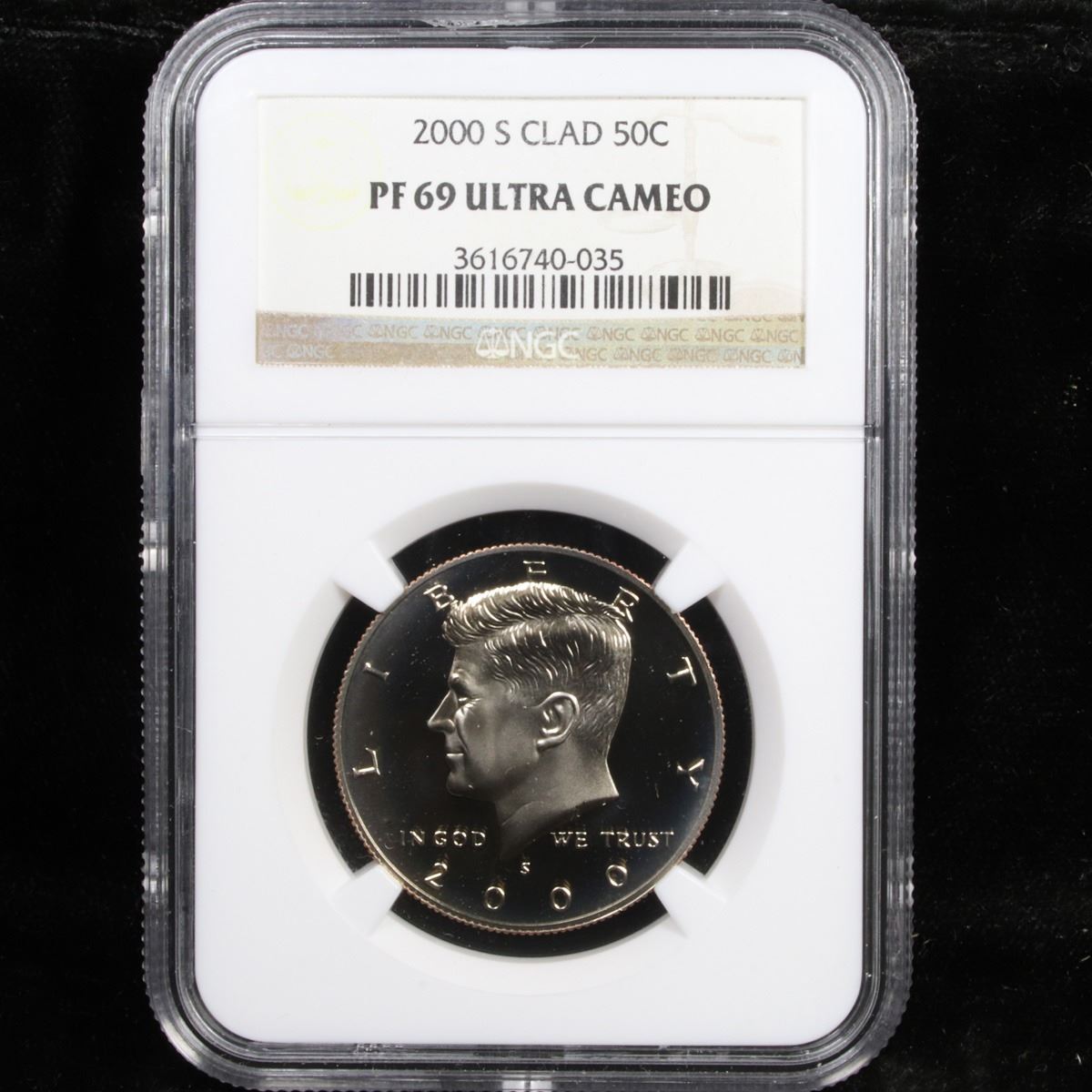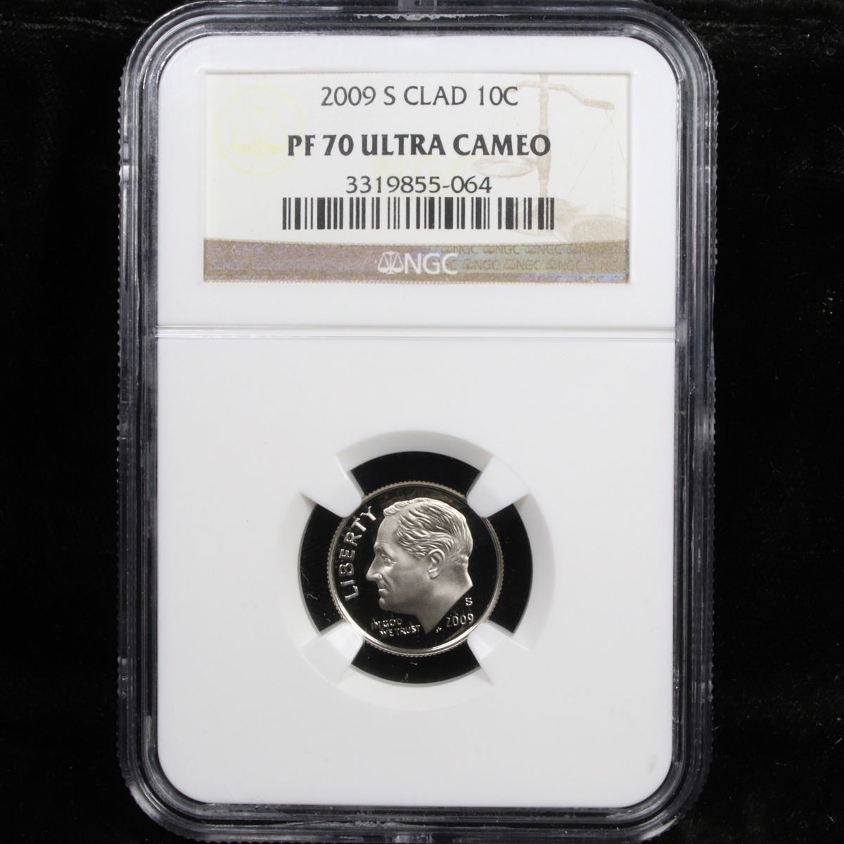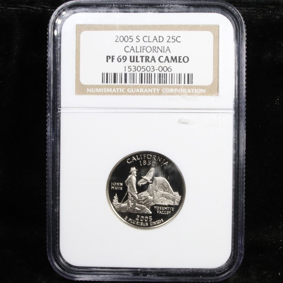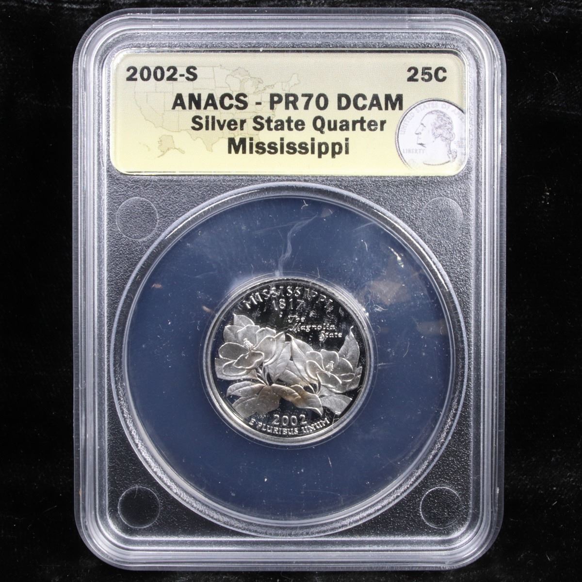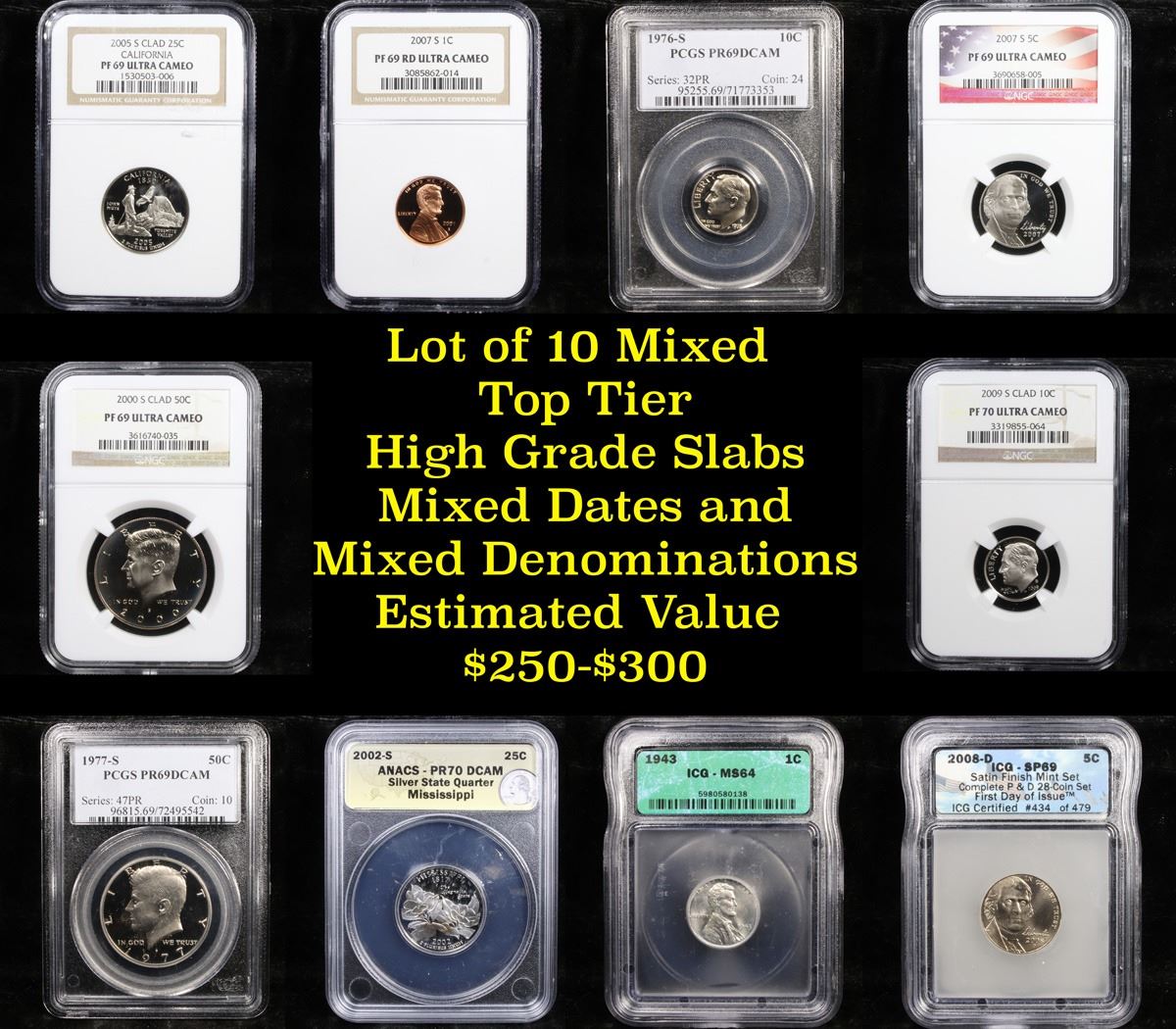 10 High Graded Top Tier Slabed Coins . 2000-s clad 50c pr69 dcam by NGC, 2008-d 5c sp69 by ICG, 2009-s clad 10c pr70 dcam by NGC, 1943-p 1c ms64 by ICG, 2002-s Mississippi 25c pr70 dcam by ANACS, 1977-s 50c pr69 dcam by PCGS, 2007-s 5c pr69 dcam by NGC, 1976-s 10c pr69 dcam by PCGS, 2007-s 1c pr69 dcam by NGC, 2005-s clad California 25c pr69 dcam by NGC. Estimate $250-$300 ****Please Note you will Revieve exact slabs pictured in lot
