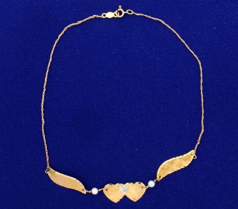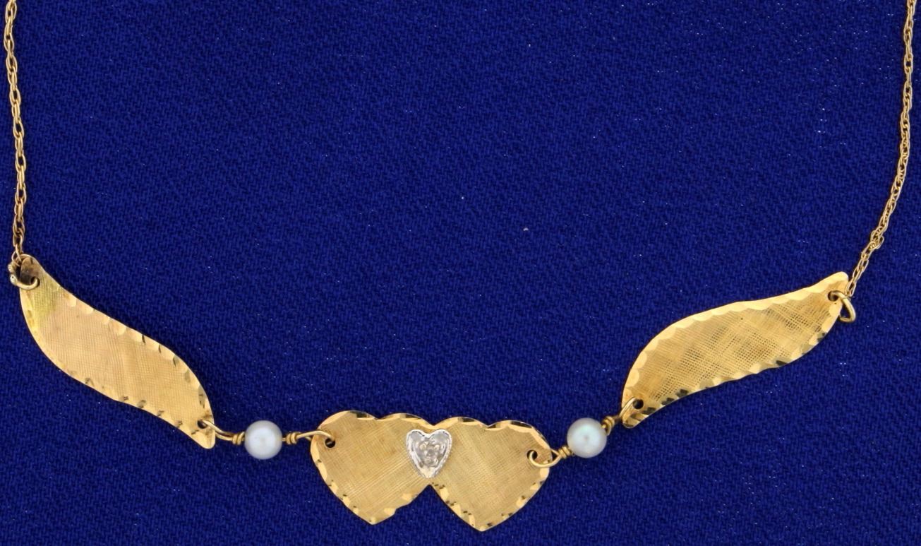 In 14k yellow gold, containing two 3mm pearls and one .01ct diamond. 1.4g.