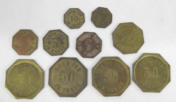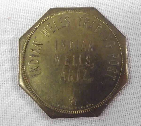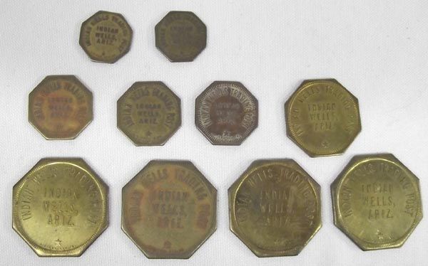 10 Indian Wells Trading Post Tokens from Indian Wells, Arizona, to include: 4 $1 Hexagon, 1- 25 cent hexgon, 3- five cent hexagon, 2 ten cent hexagon