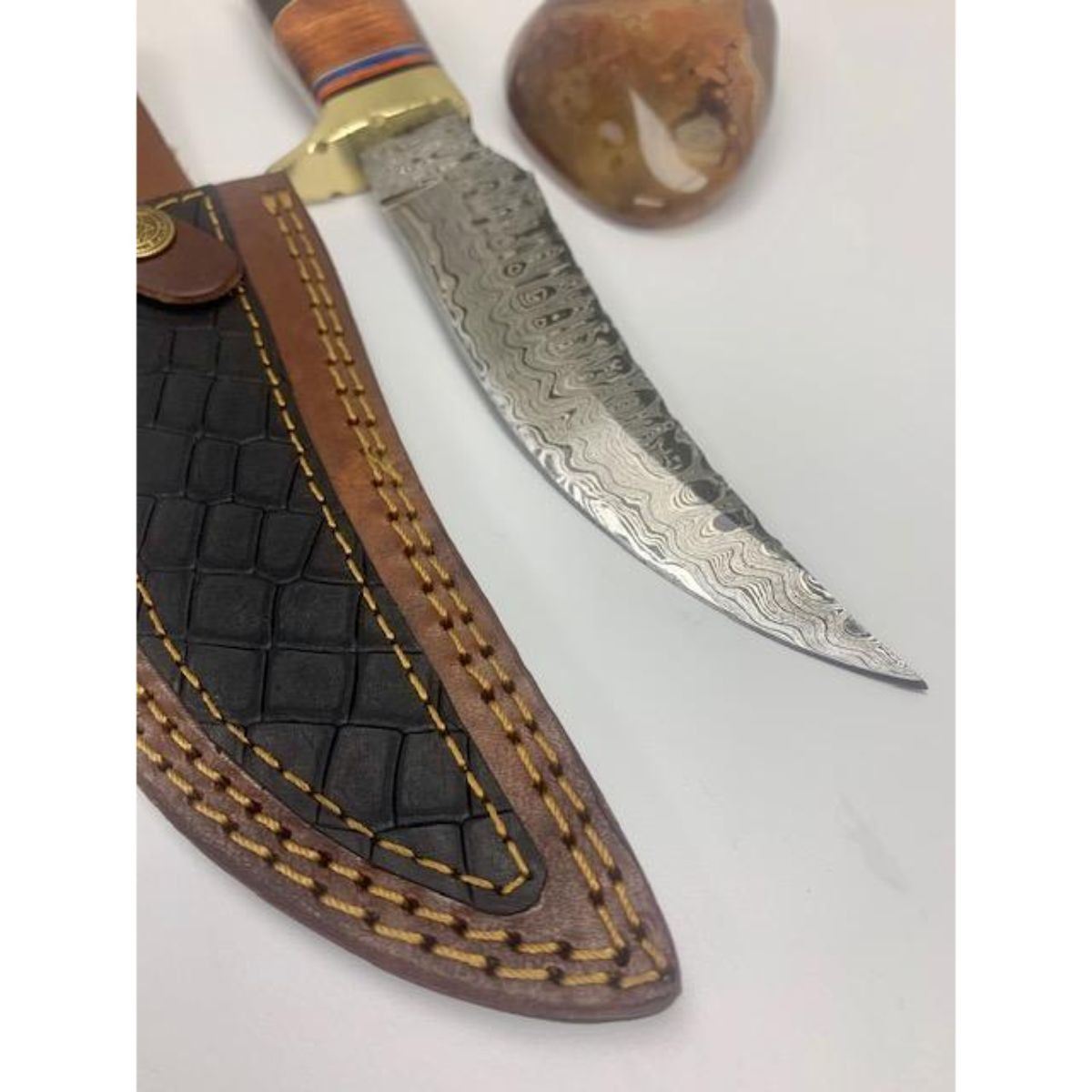 10"Â Inlaid Wood & Brass Handle Damascus Hunting Knife With Stitched Leather Sheath An Excellent Hand Crafted Shive To Add To Any Collection. High Quality steel is utilized to forge the finest product in the world. Unique Custom Hand-Forged Damascus Steel Hunting Blade Construction:Colored Wood and Brass Spacers. Blade Construction: This superbly designed Marquetry Worked Wood Handle Damascus Hunting Knife is Custom Made & Designed. The Blade is crafted by hand forging 216 Layers of 1095 and 15N20 high carbon tool steels, with Nickle layer. Blade has been given excellent heat treatment to get a 56 to 57 HRC. Blade has a razor sharp edge. Sheath Construction: High Quality Thick Genuine Stitched Leather Total Length: 10" Length View Photos For Further Details