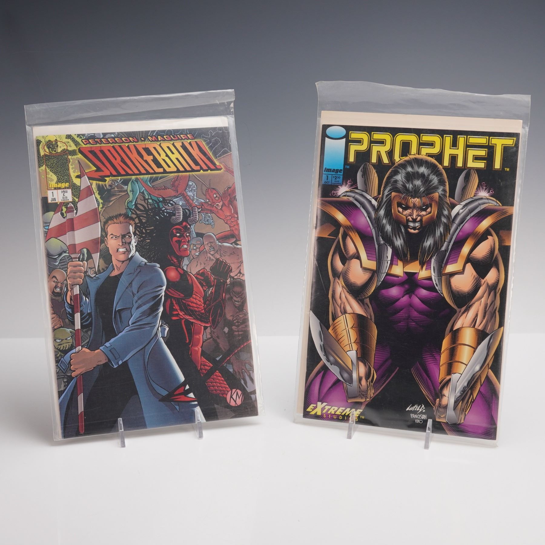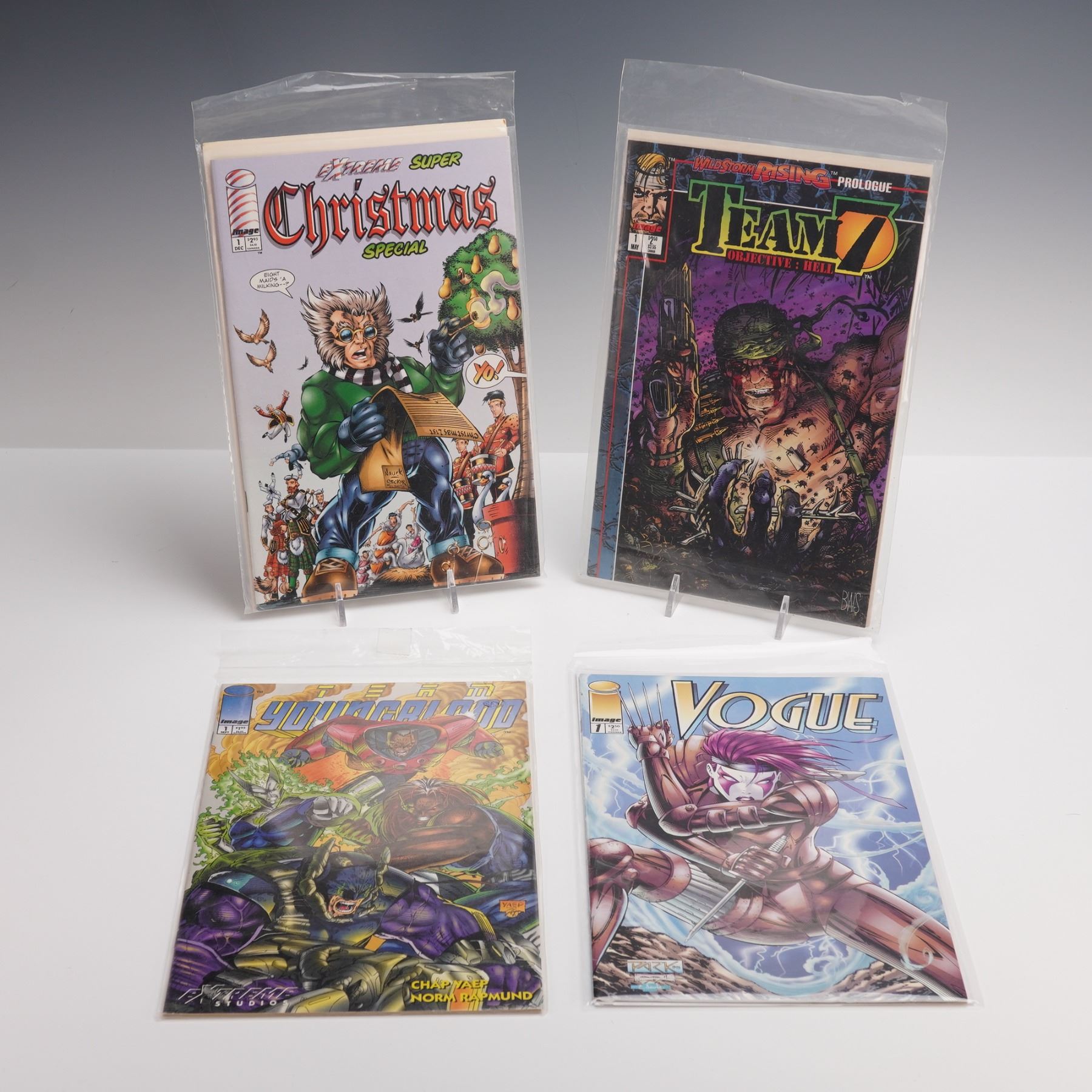 Including titles from the early 1990s independent publisher known for bold artwork and original characters. The lot features Prophet, centered on a genetically enhanced super-soldier; Strikeback, with themes of patriotism and team battles; Wildstar, following a man bonded with an alien symbiote; and Black Ops, focused on a covert team of operatives. Also included are Defcon 4, a futuristic action series; Extreme Super Christmas Special, a holiday-themed issue with characters from the Extreme Studios universe; Youngblood, a pioneering superhero team book; Vogue, spotlighting a Russian-born supermodel turned heroine; Team 7: Objective Hell, telling the backstory of elite soldiers; and Image Universe Sourcebook, a reference guide to interconnected characters and story lines.