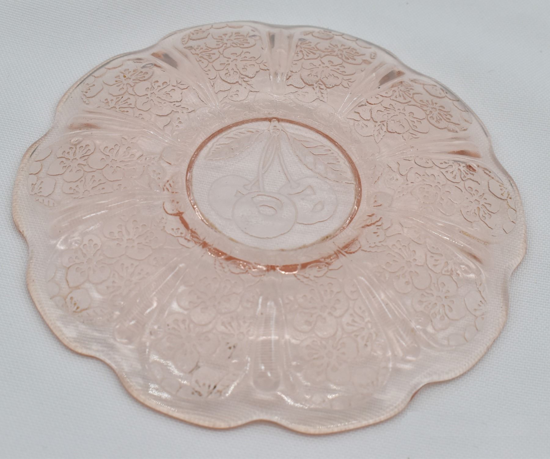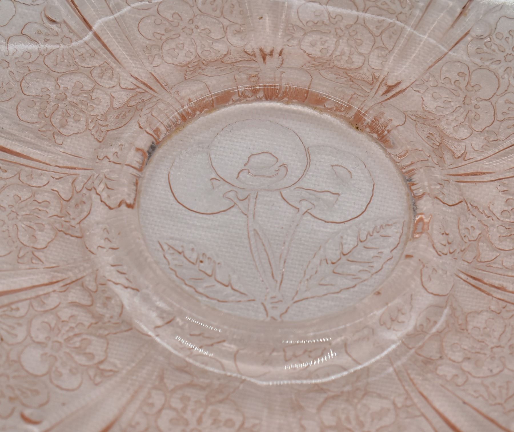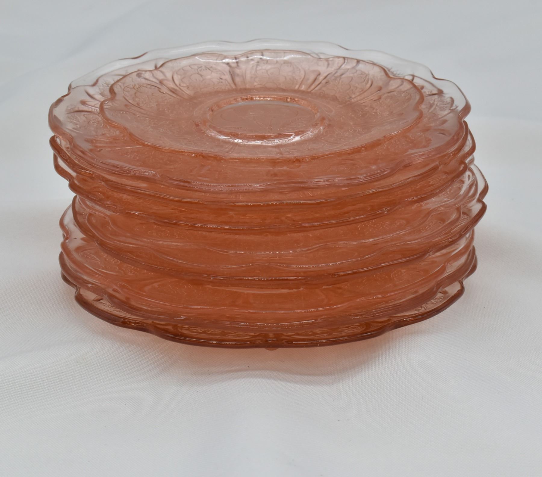 10 Jeannette Pink Depression Glass Saucers, includes one 5''D and nine 6''D (one has a chip)