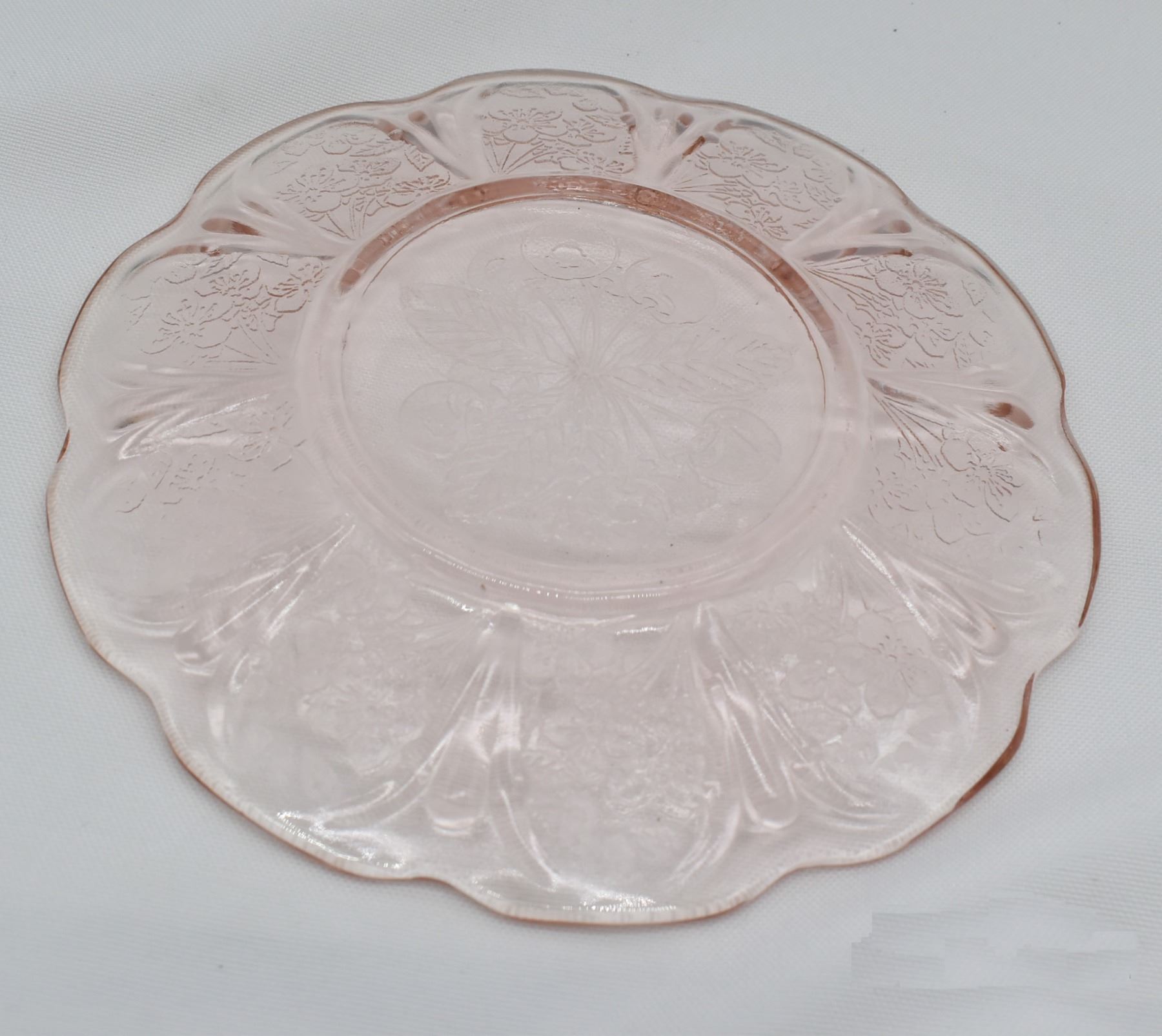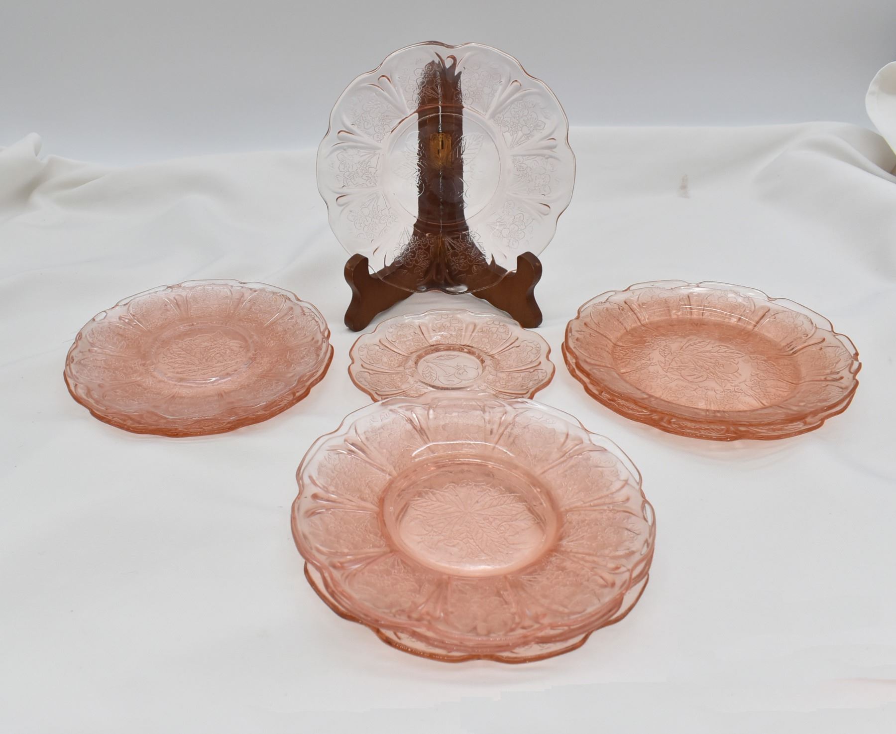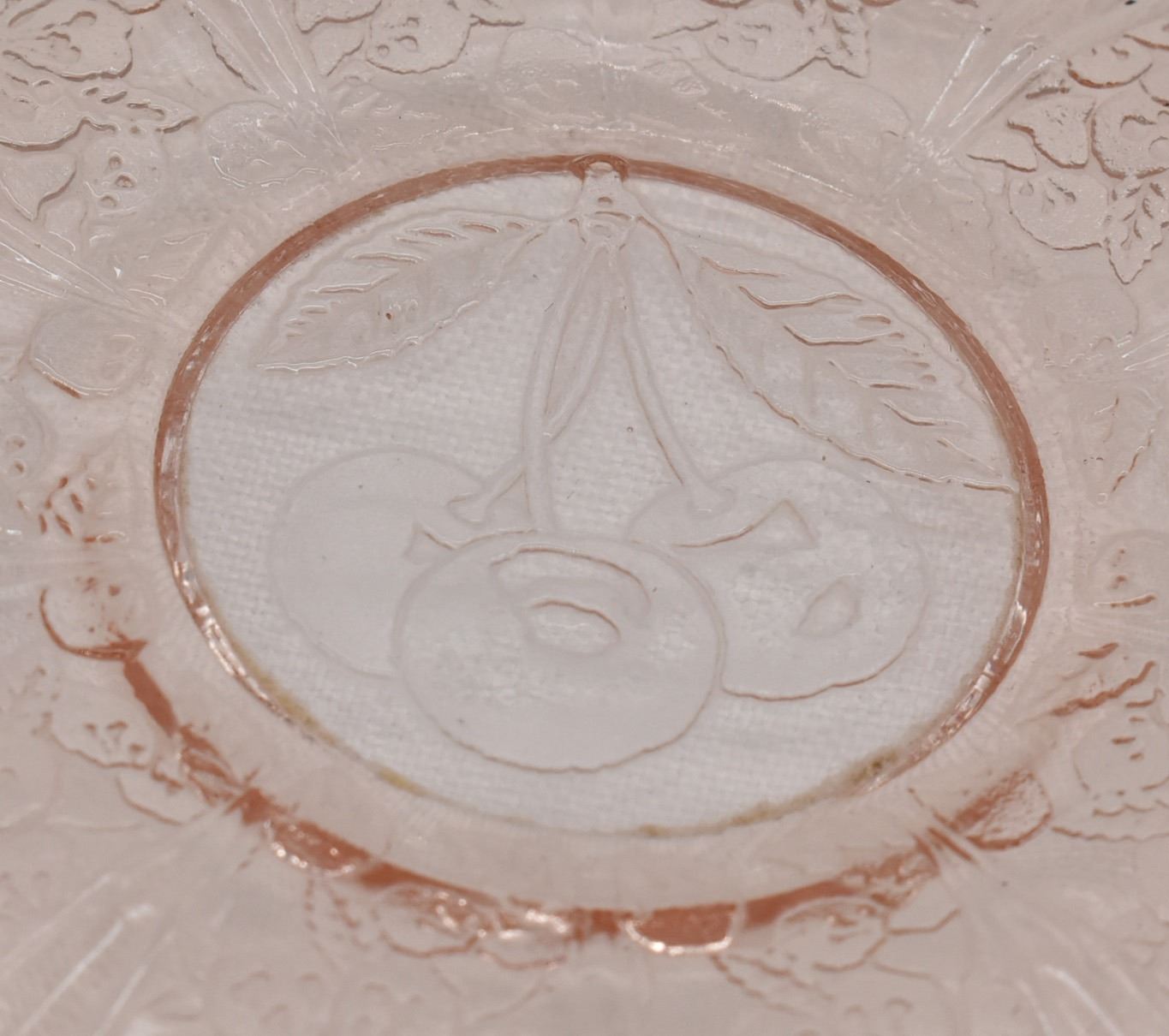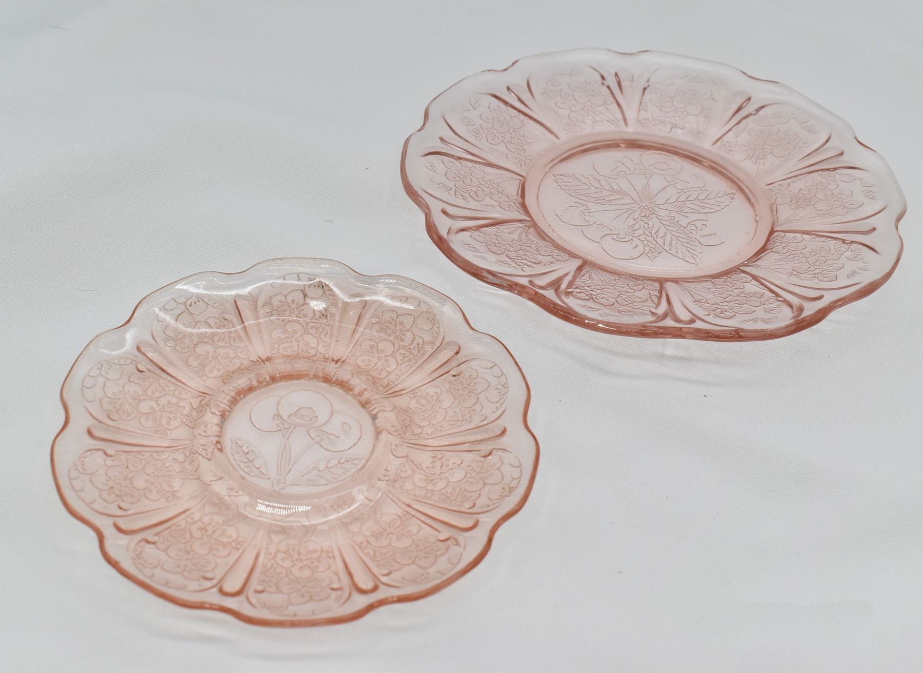 10 Jeannette Pink Depression Glass Saucers, includes one 5''D and nine 6''D (one has a chip)