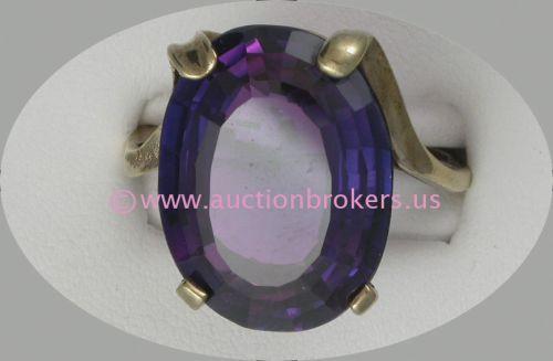 10 K YELLOW GOLD LADIES GEMSTONE RING SET WITH AN OVAL AMETHYST STONE 20 X 15 MM. 7.7 GRAMS.