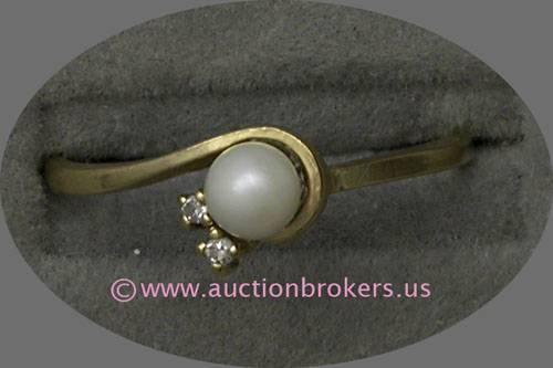 10 K YELLOW GOLD LADIES GEMSTONE RING SET WITH ONE CULTURED PEARL APPROXIMATELY 4.5 MM AND ONE ACCENT PROMOTIONAL GRADE DIAMOND. 1.4 GRAMS.