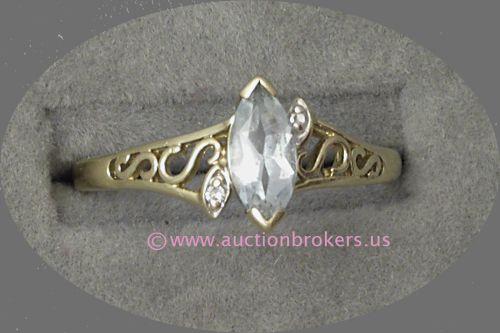10 K YELLOW GOLD LADIES GEMSTONE RING SET WITH ONE MARQUISE CUT BLUE TOPAZ AND TWO PROMOTIONAL GRADE DIAMONDS. 2 GRAMS.
