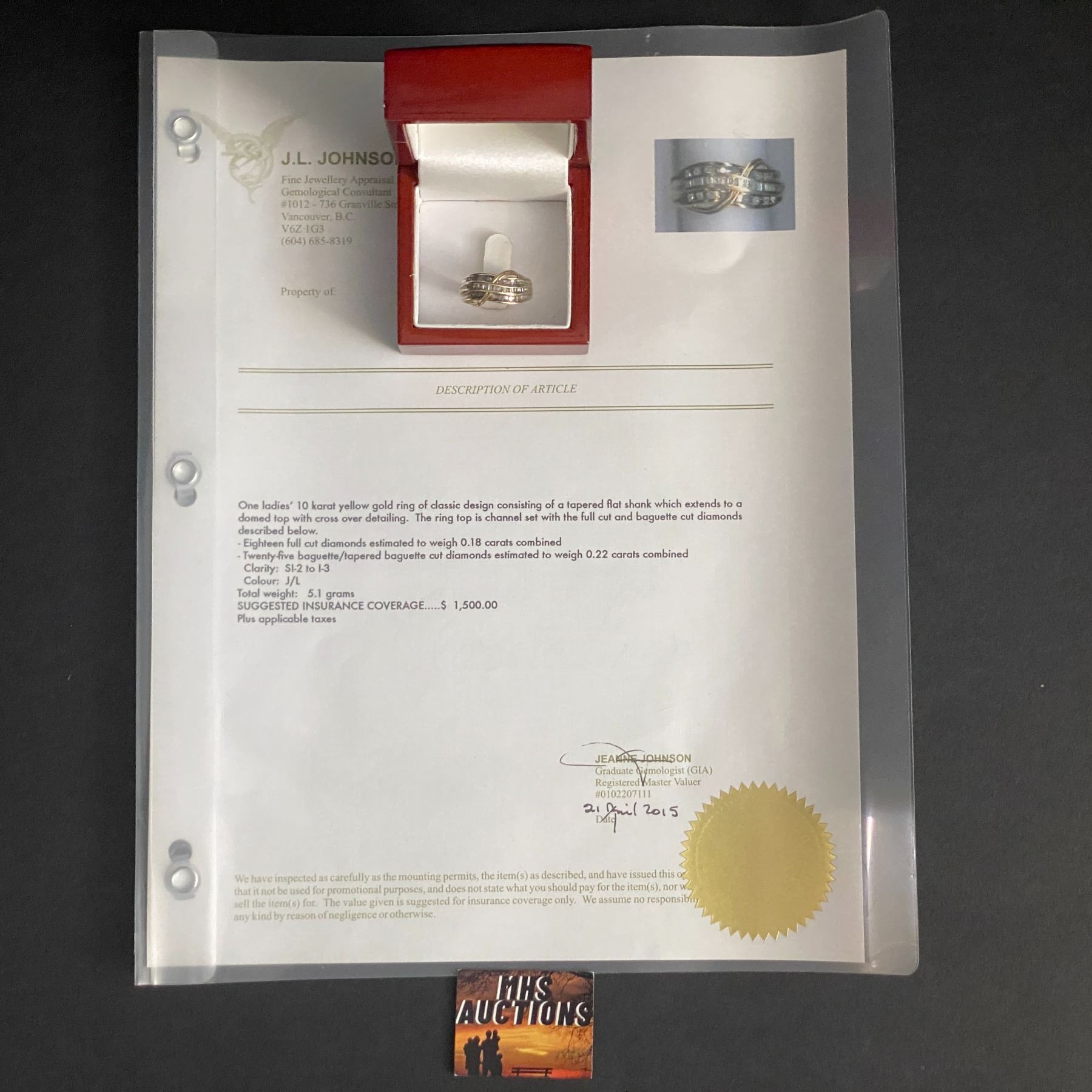 10 KARAT YELLOW GOLD RING TOTAL WEIGHT 5.1 GRAMS INSURABLE VALUE $1,500.00