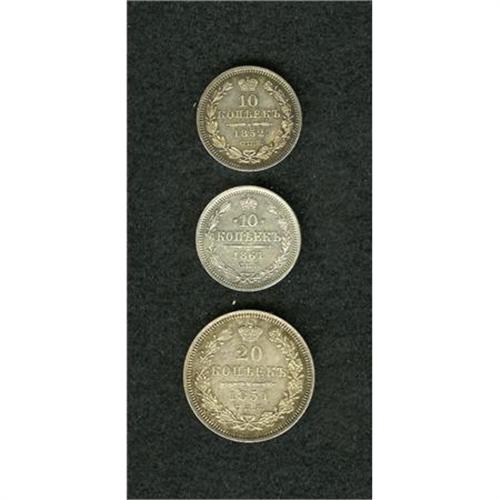 <B>An interesting minor coin trio as follows.</B></I> 10 Kopecks 1852 C??-??, KM164.1, Choice toned AU; 10 Kopecks 1861 C??-?, KM20.2, XF; and a 20 Kopecks 1851 C??- ??, KM165, lustrous AU.<BR><BR><b>Shipping:</b> Coins & Currency (<a target="_blank" href="http://www.heritageauctions.com/common/shipping.php">view shipping information</a>)