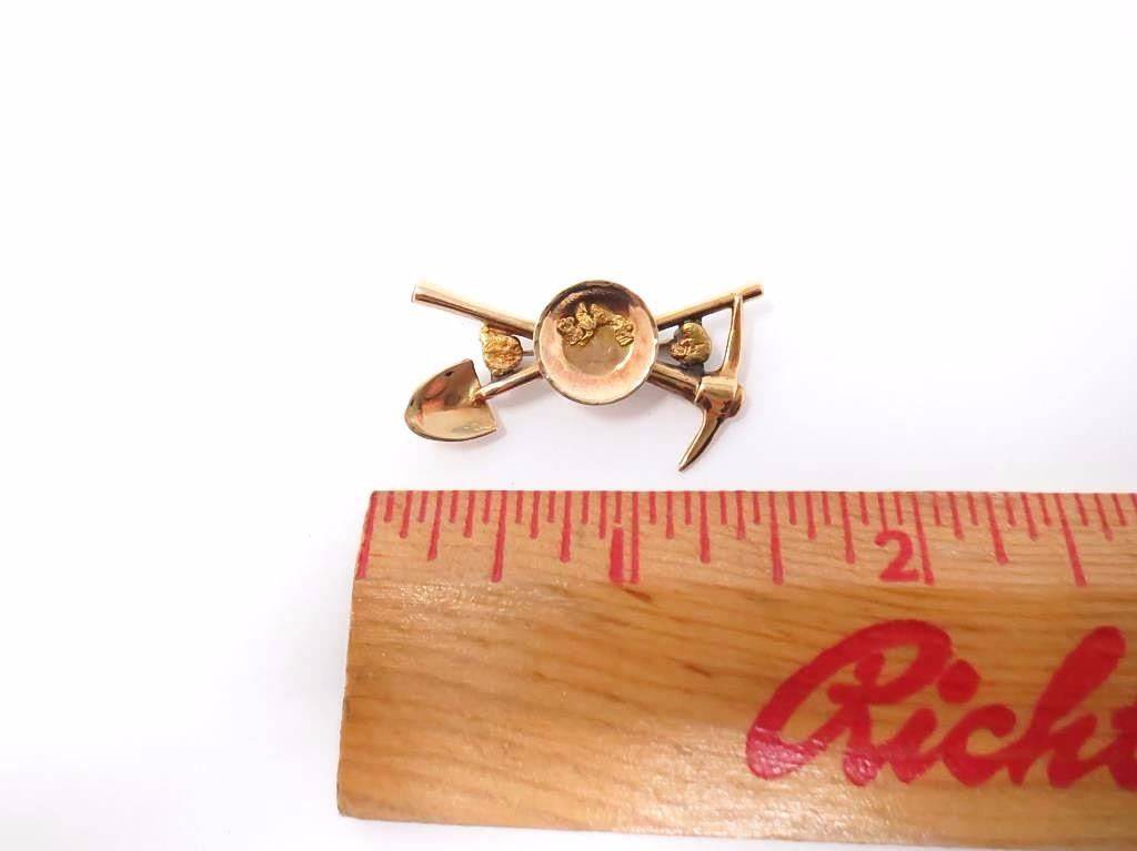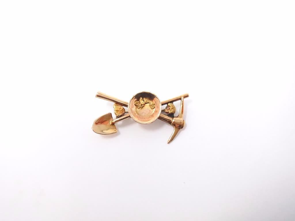 in the form of crossed shovel and pick and gold pan. There are six natural gold nuggets included, four in the pan and two on the pick and shovel.