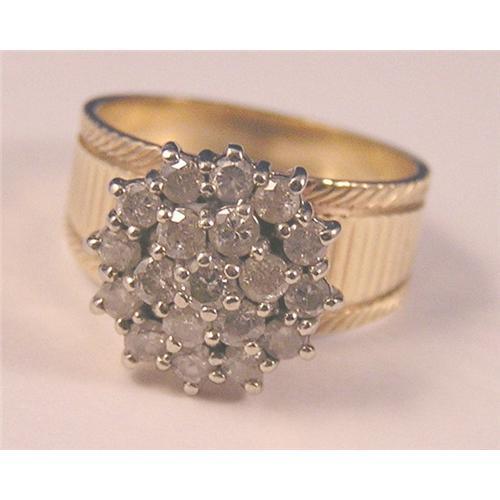 10Kt yellow gold tapered wide band with a round cluster setting of nineteen (19) samll diamonds prong set. After 25 years in this business we will be closing our shop. All our items have been greatly reduced in price. We will consider offers.