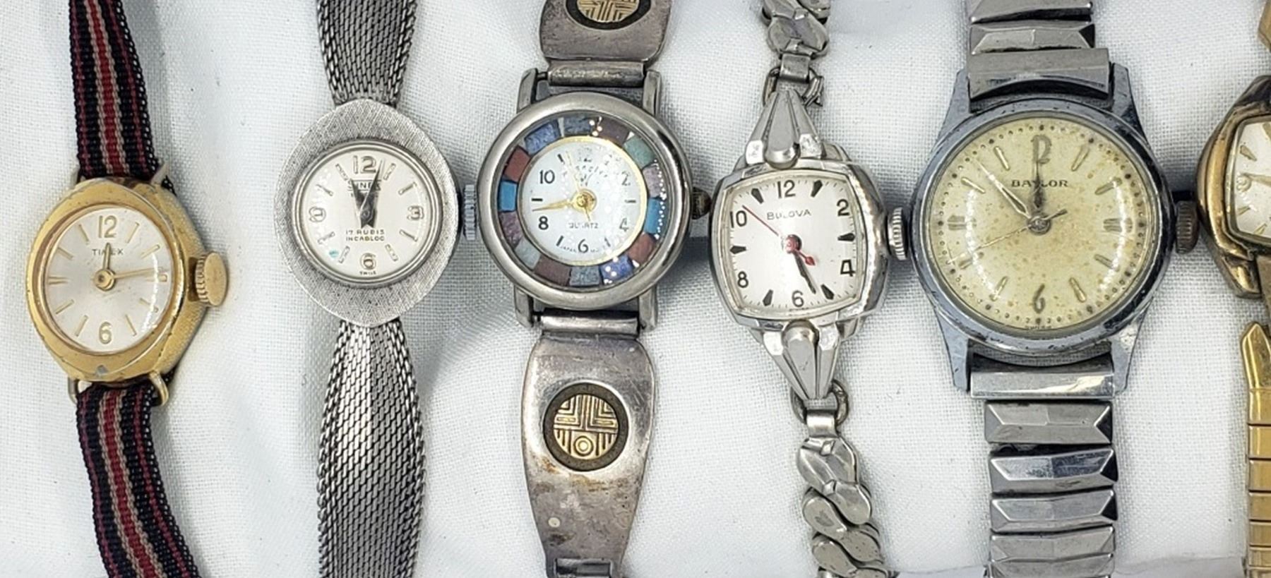 CARIOLIE (BAND DISCONNECTED), VANTAGE (RUNS), BULOVA (10k GOLD FILLED) CROSBY, WRANGLER, BULOVA, BAYLOR, SINEX, BULOVA (RUNNING), TIMES (NOT RUNNING UNLESS MENTIONED- NO MISSING PARTS UNLESS MENTIONED)