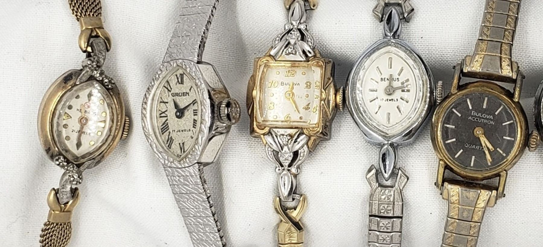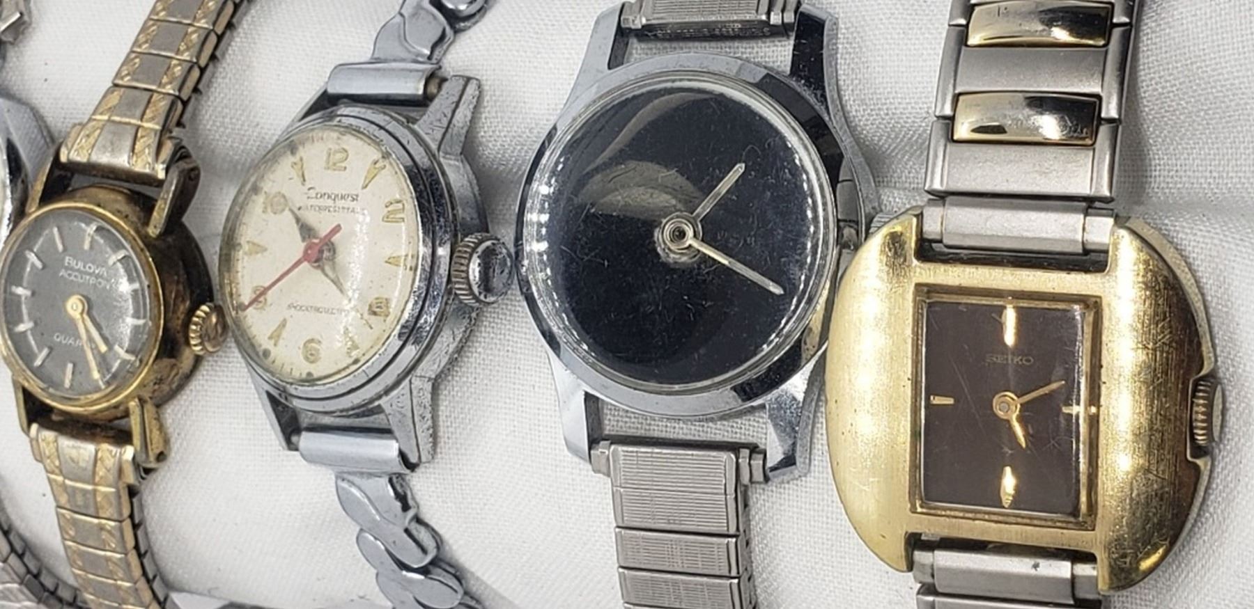 2-BULOVA, ENDURA (BAND BROKE), WALTHAM, BENRUS, GRUEN, CONGUEST, SWISS MADE?, SEIKO, HELBROS (BAND BROKE) - ((NOT RUNNING UNLESS MENTIONED- NO MISSING PARTS UNLESS MENTIONED)