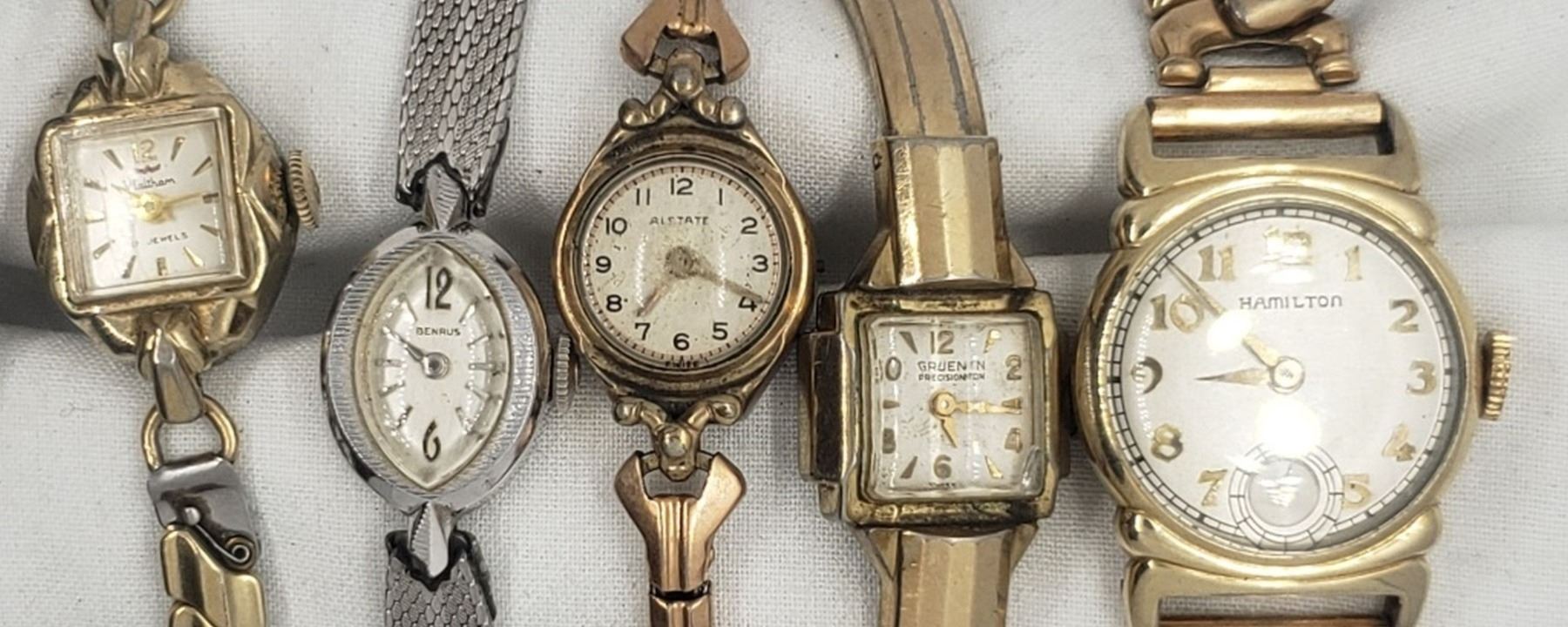 GRUEN, BULOVA, REXTON, BULOVA 10k GOLD FILLED, WALTHAM, BENRUS, HAMILTON 14k GOLD FILLED, LADY NELSON (MISSING STEM), BULOVA (CRYSTAL MISSING), ALSTATE (MISSING STEM) - (NOT RUNNING UNLESS MENTIONED- NO MISSING