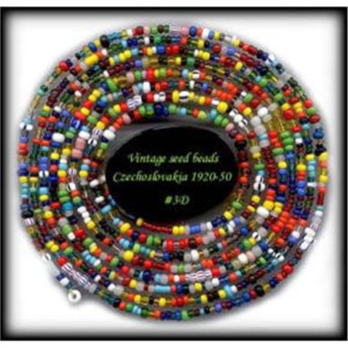 Here is a rare find from a hoard of old (unused) Bohemian beads made in Czechoslovakia between 1920-50's for export to Africa. Just found that the beads we have are also referred to as "Christmas" in the U.S. or "Love" beads in West Africa. Same type of beads (Item #5028240515) described as "African Christmas Trade beads" sold on Ebay for $31.00. This lot had 6 strands in total length of 204 inches. Our 10 lbs lot if strung would measure 19948 inches, which is almost 100 times more and would equal to $3031 value, based on the winning bid. The really interesting thing about most of these beads is that unlike the modern Czech beads, these beads are shaped more like old Italian seed beads, being more "donut" shaped instead of "barrel" shaped. This means that the diameter is larger than the thickness, and some of the beads are much like little "ring" donuts. This shape makes old style "overlay" and "lane stich" (lazy stich) beadwork look much better. Replicas made using these old beads as the background just look more authentic! They are also slightly irregular like the old Italian beads. This is huge amount of beads - weight of this lot is 10 lbs. Size range is from #7 to smallest #20 in full scale of colors - transparent, opaque and striped beads. To show better detail, pictured is (washed) randomly picked and strung assortment, which is 58 inches long, contains 900 beads and weighs 13.2 grams. To save you some time, here are some figures (based on the pictured assortment) what ...