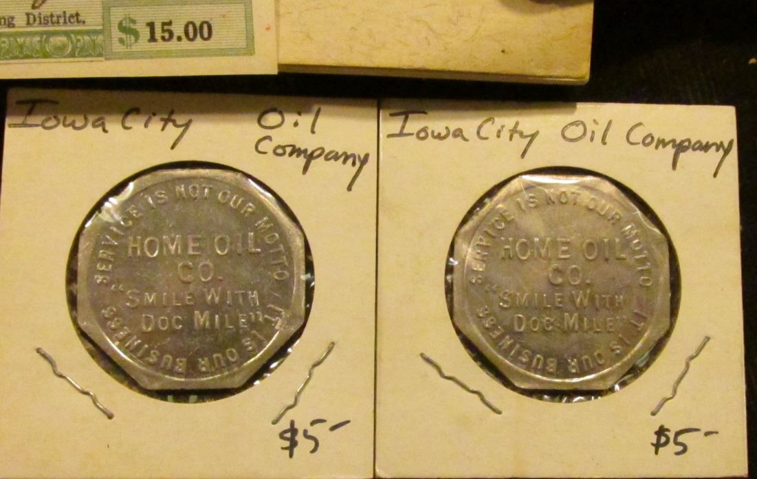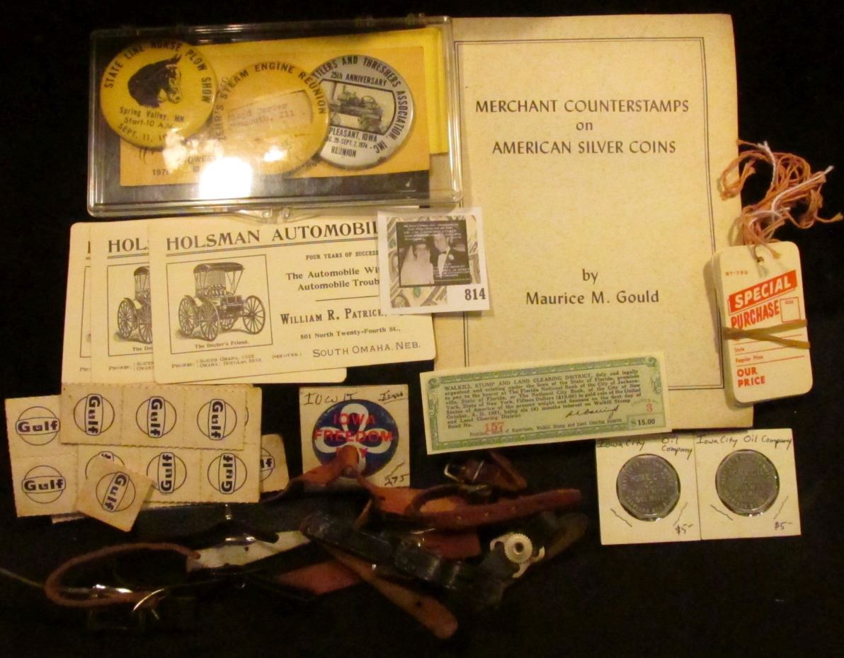 (10) Leather Watch Fob Bands; (4) "Holsman Automobiles….South Omaha, Neb." Advertising Ink Blotters; small group of hang tags; a few "Gulf" Oil cards; pair of 1976 Souvenir Tickets Midwest Central RR Midwest Old Settlers and Threshers Mount Pleasant, Iowa; "State Line Horse Plow Show Spring Valley, Mn Start-10A.M. Sept. 11, 1982" Pin-back; "Zehr's Steam Engine Reunion" Pin-back; 1974 Pin-back for Midwest Old Settlers and Threshers Mount Pleasant, Iowa; "Iowa Freedom Day May 14, 1980" Pin-back; pair of 25c Good For Tokens "Service is not our Motto/Home Oil/Co./"Smile With/Doc Mile"/It Is Our Business"; Coupon No.3 Bond No. 157 "Walkill Stump and Land Clearing District...pay to the bearer at the Florida National Bank...Fifteen ($15.00) in Gold Coin of the United States of America..."; and a rare booklet "Merchant Counter stamps on American Silver Coins" by Maurice M. Gould.
