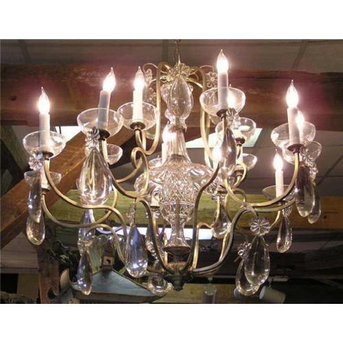 This unique pewter ten-arm chandelier features tear drop shaped crystals that are almot five inches long and one inch deep. Recently cleaned and electrified and in fine working order. Measures 27" wide and 25" high. One thin metal arm at the top is missing, but could certainly be replaced by a professional metalsmith. This item resides in Red Bank NJ and may be seen by appointment.