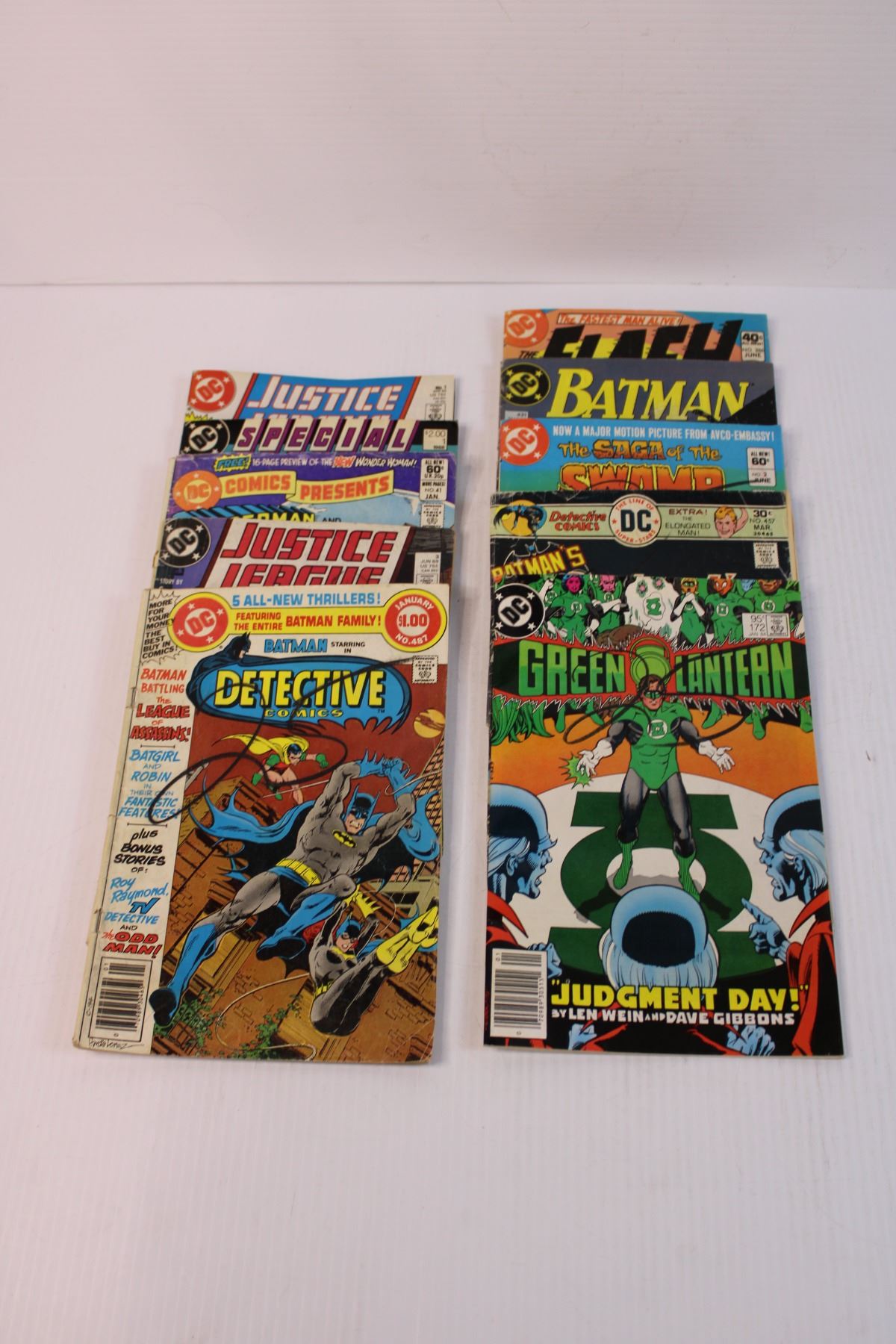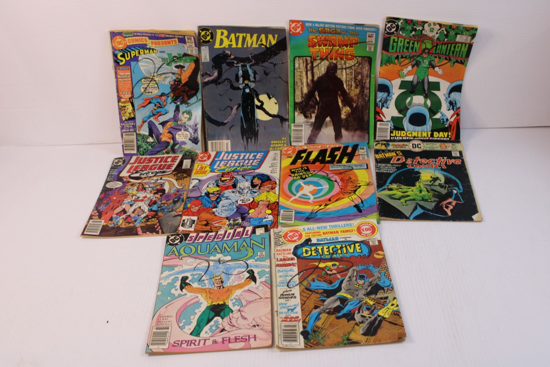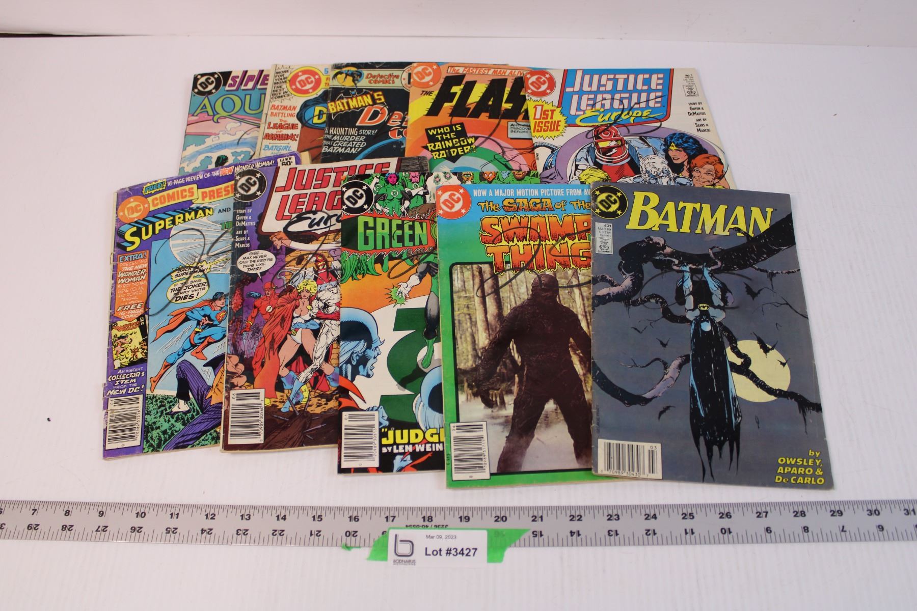 (10) Lot of Assorted Comic Books - Batman, Aquaman, The Flash (Some Have Black Pencil Marks on the Front Cover, Two are in Worn Condition, One Has Cover Not Attached)