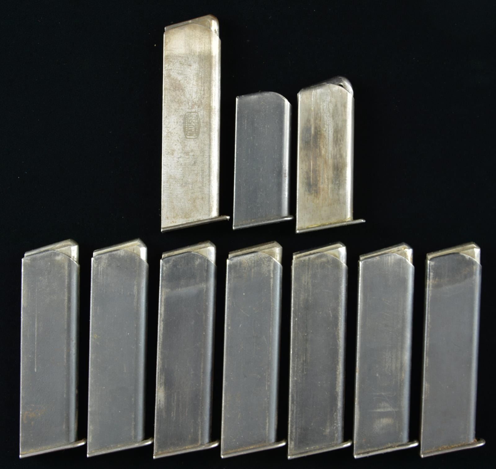 All good serviceable condition Mauser marked factory mags. w/ rounded front side latch bases (unless noted). 6 Model 1910 w/ 9 holes on left sides of bodies. / 1 w/ rectangular base & Mauser emblem on right side plus 3 slots on left. / 1 w/ 5 holes per side appearing for WTP-II. / 1 w/ 2 slots on left side, long rectangular base & no markings; appears original for WTP-I. (02-16951-19). $350-500.