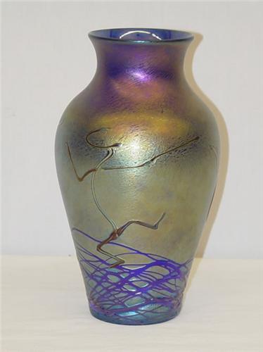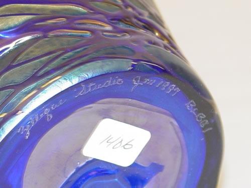 10" MODERN ART GLASS VASE-BLUE IRIDESCENT W/ DANCER SIGNED ON BASE ZELLIQUE STUDIO JAN. 1997 BLBGI - PONTIL, GREAT COLOR