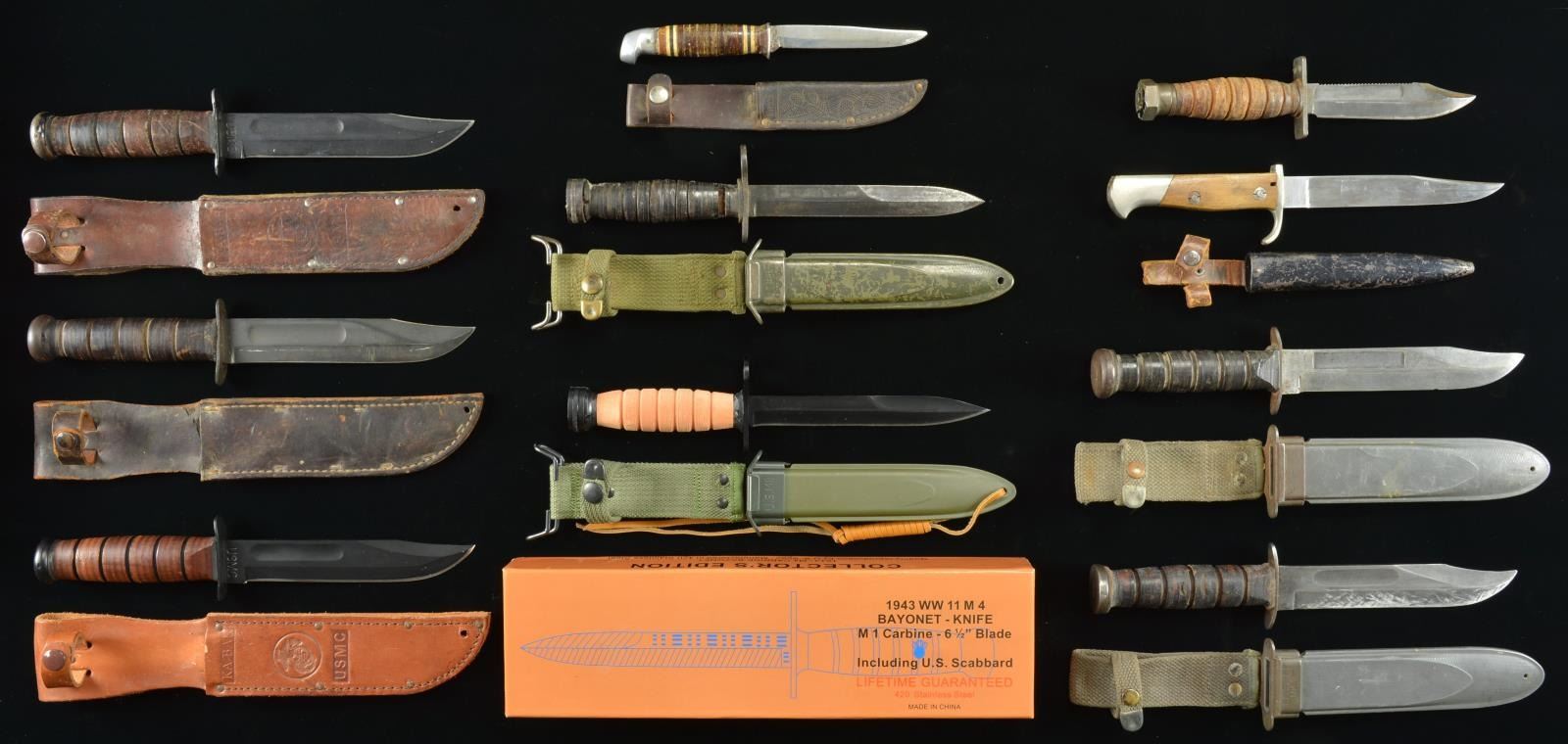 This group includes 1 US M4 bayonet marked on the underside of the guard "U.S. M4 K.I.". Standard sheath marked "U.S. M8A1 V.P.C.O.". Grip is well worn with one missing section. / 1 Navy pilots survival knife with the later 5" blade indicating the post 1962 production. No sheath. / 1 U.S.M.C. fighting knife marked at the ricasso "USMC" & "KA-BAR OLEAN, N.Y.". Brown leather sheath marked "KA-BAR (ega) USMC". / 1 U.S.M.C. fighting knife marked at the ricasso "USMC" & "KA-BAR". Dark brown leather sheath is void of markings. / 1 U.S.M.C. fighting knife marked at the ricasso "USMC" & "KA-BAR OLEAN, N.Y.". Brown leather sheath marked "KA-BAR (ega) USMC". Knife is in like new condition. / 1 WWII style M4 bayonet of current Chinese manufacture for the M1 carbine in original box. / 1 WWII era hunting knife with stacked washer grip. Brown leather sheath marked "ESTWING". / 1 WWI era German fighting knife lightly marked "NAHKAMPFER" on the blade & stamped "NAHKAMPFER D.R.G.M." on the ricasso. 2 Piece wood grip with bird head style pommel. Black painted metal scabbard with brown leather belt loop. A leather retaining loop is broken. CONDITION: all items show expected light to moderate wear except as individually noted. (02-17995-2/BF). $700-900.
