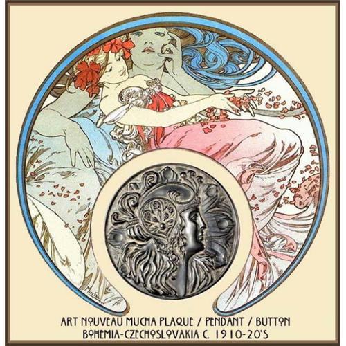 Gorgeous masterpiece of the Art Nouveau movement - This period plaque / pendant based on A. Mucha design was used as a centerpiece in the Art Nouveau jewelry creation. It is composed of a black glass with very fine detail and satin sheen finish. The back has 4 attached black metal "eye" hooks, which we had custom made for this piece. With the black glass - it is so difficult to capture the beauty, which eye so easily perceives... To see better the detail, we took the photo of pendant in its original condition (uncleaned). Last picture shows this plaque after it was washed. This treasure survived its 80+ years of age in excellent condition. Dimension: 2 inches in diameter and about 3/16 inches thick. It is your choice to have the piece with or without shanks on the back. Displayed is beautiful necklace, designed and made by local jewelry designer, just to see what can be done with this great centerpiece. The vintage beads used for this necklace were from our inventory and are also available if interested. Please note, that pictured is 1 piece, but you are bidding on 10 Mucha plaques.