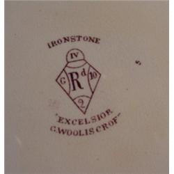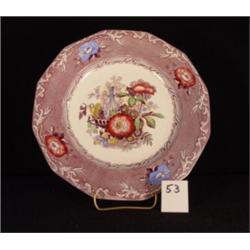 10" Octagonal Staffordshire mulberry colored transferware by G. Wooliscroft in "Excelsior" pattern with red, light blue and green hand painted decoration. Small brown stained area, but no chips, cracks or flakes. There is a printed #5 underneath.