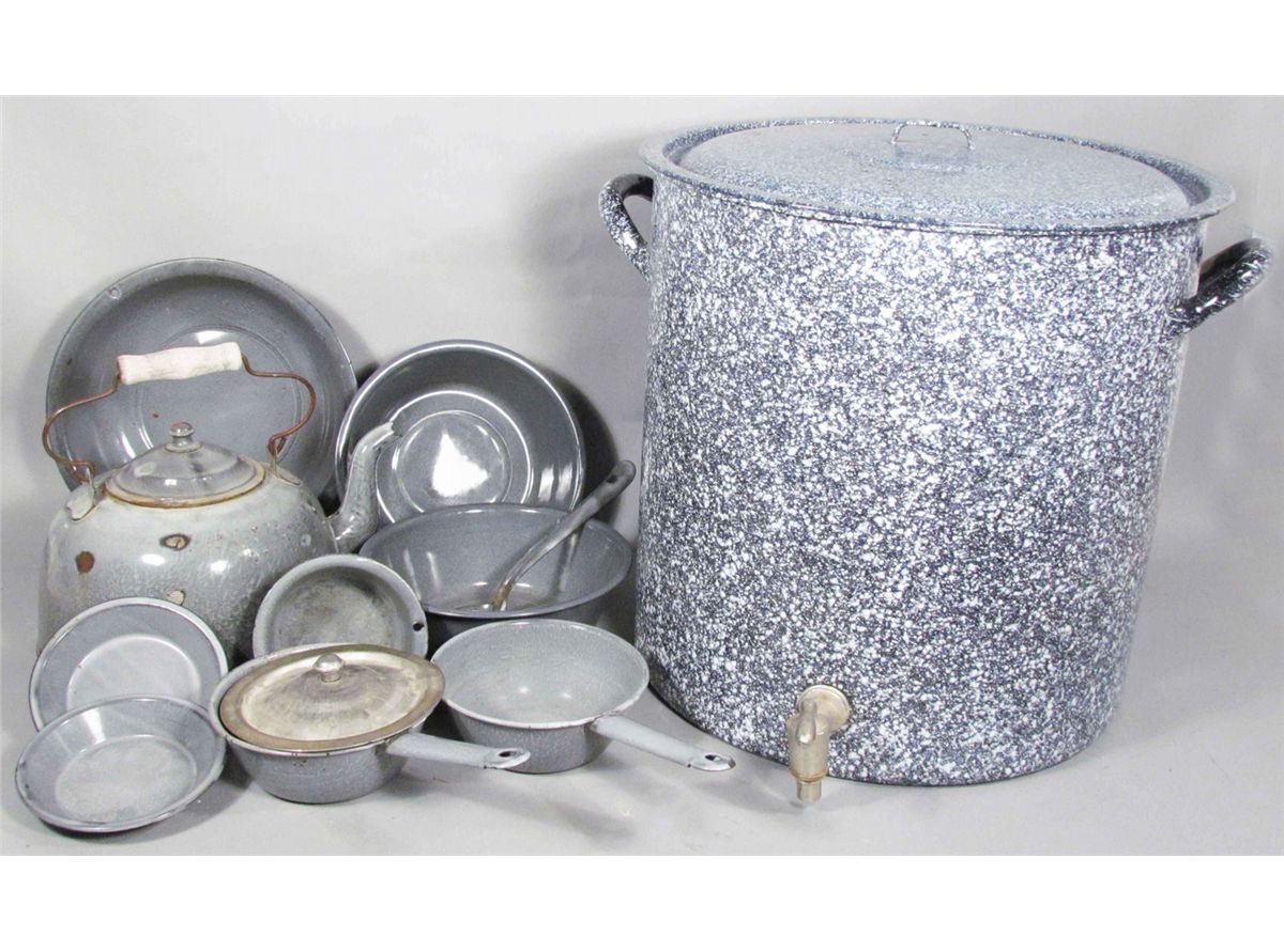 10 Misc. Pieces of Grey Graniteware. Large lidded pot with spigot and tea kettle. The large pot measures 18 inch diameter X 18 inches tall.