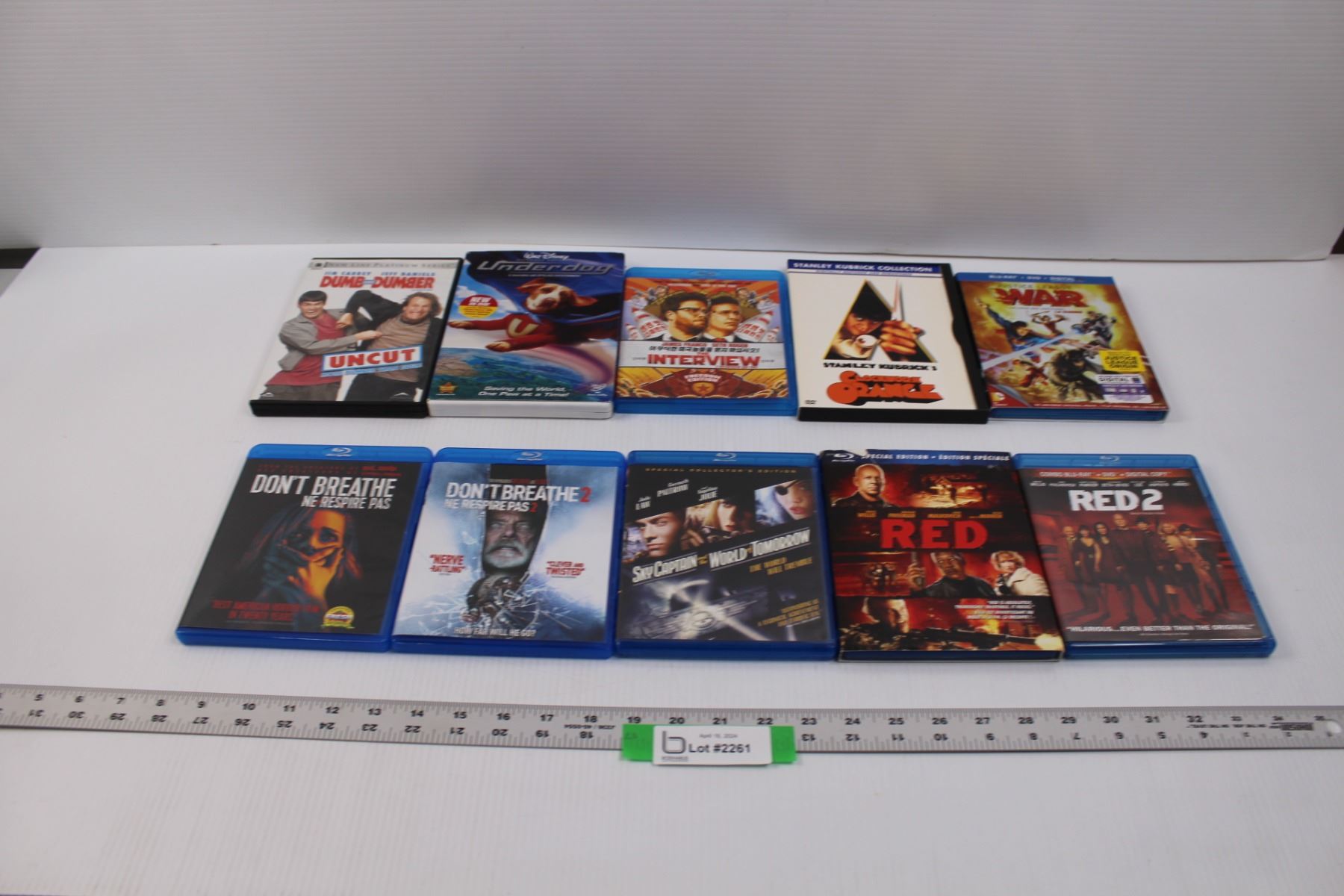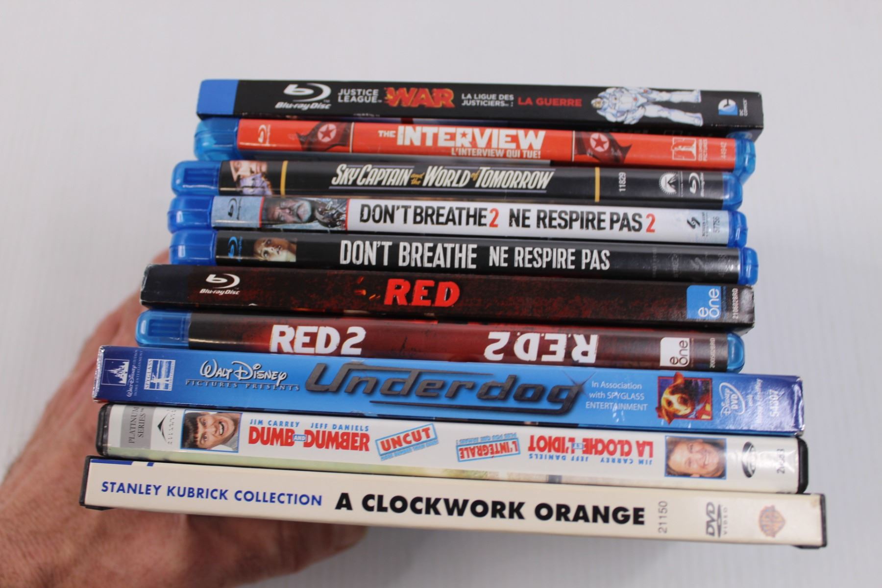 (10) Movies 7) Blue-Ray, 3) DVDs - "Dumb and Dumber", "Underdog", "The Interview", "Clockwork Orange", "Justice League: War", "Don't Breath", "Don't Breath 2", "Sky Captain and the World of Tomorrow, "Red" & "Red 2"