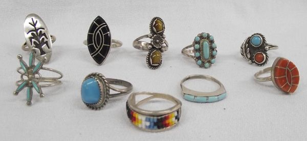 Collection of Native American Misc. Stones on Sterling Rings. 10 rings ranging in size 6.5 - 9.0. Some stamped. Older styles as well as newer designs. A lot of variety for a lot of style!