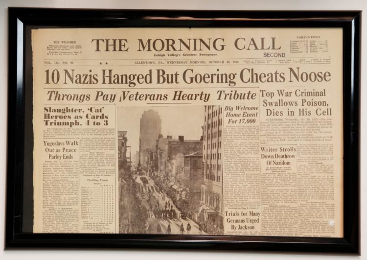 We present you with a framed front page newspaper headline from The Morning Call (Allenstown, PA), "10 Nazis Hanged But Goering Cheats Noose," published on October 16, 1946. This clipping is mounted in a 13" x 19" black frame and comes from an estate collection. This gruesome headline would make a great addition to any collection.
