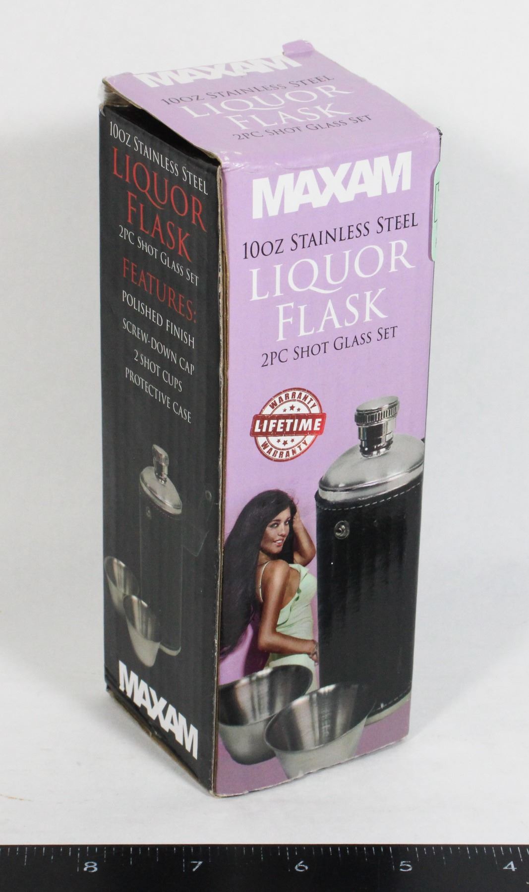 MAXAM 10OZ STAINLESS STEEL LIQUOR FLASK AND 2PC SHOT GLASS SET.