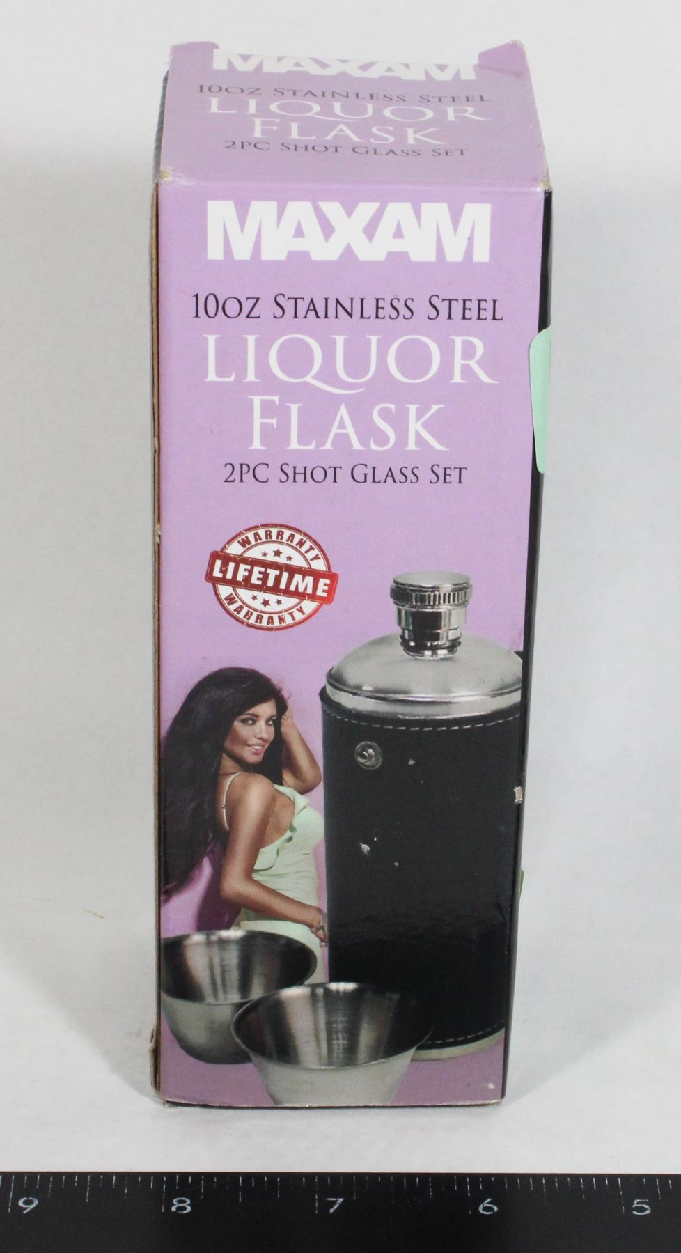 MAXAM 10OZ STAINLESS STEEL LIQUOR FLASK AND 2PC SHOT GLASS SET.