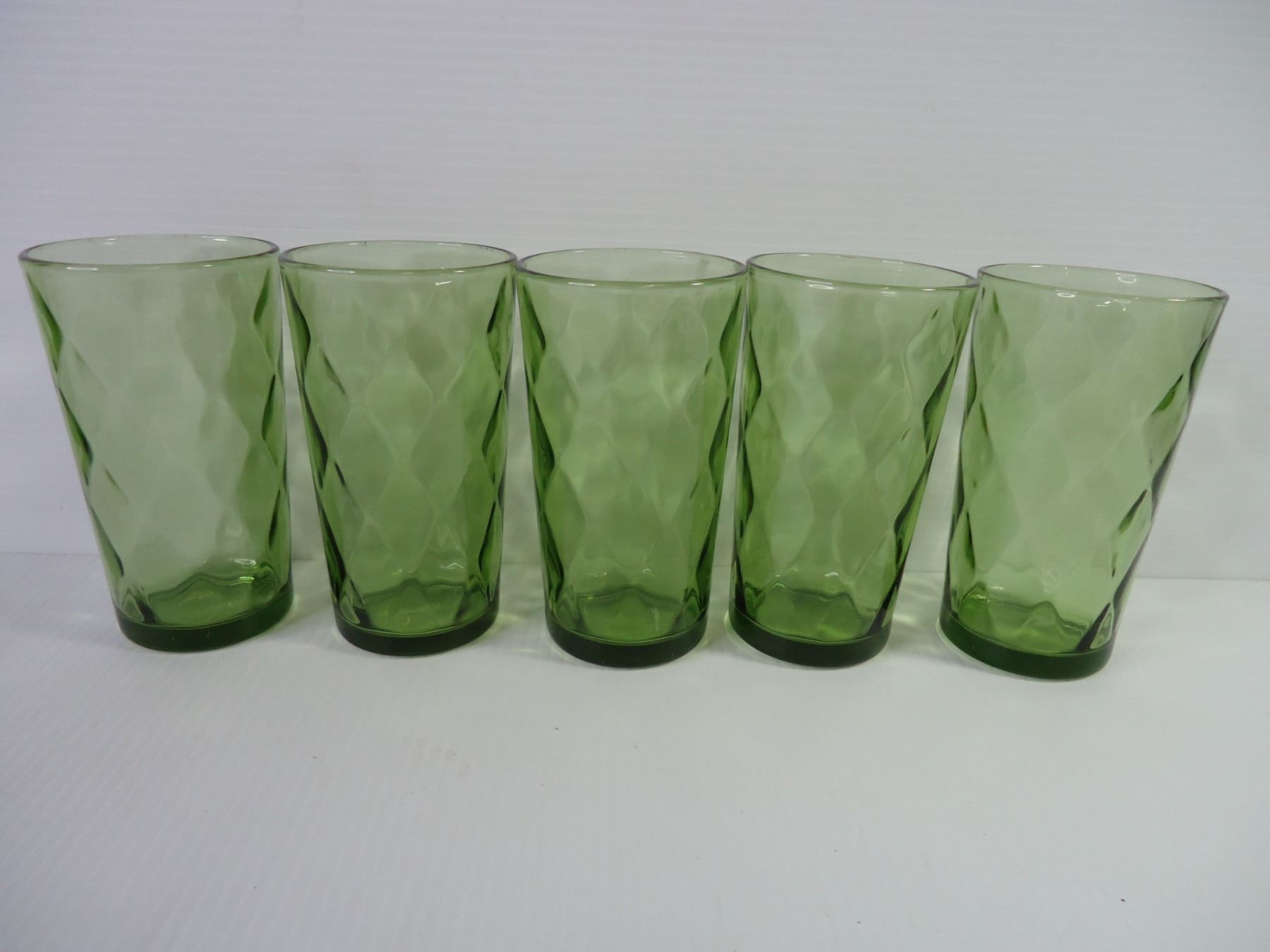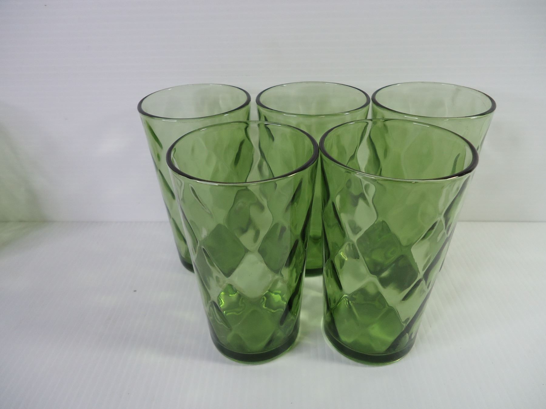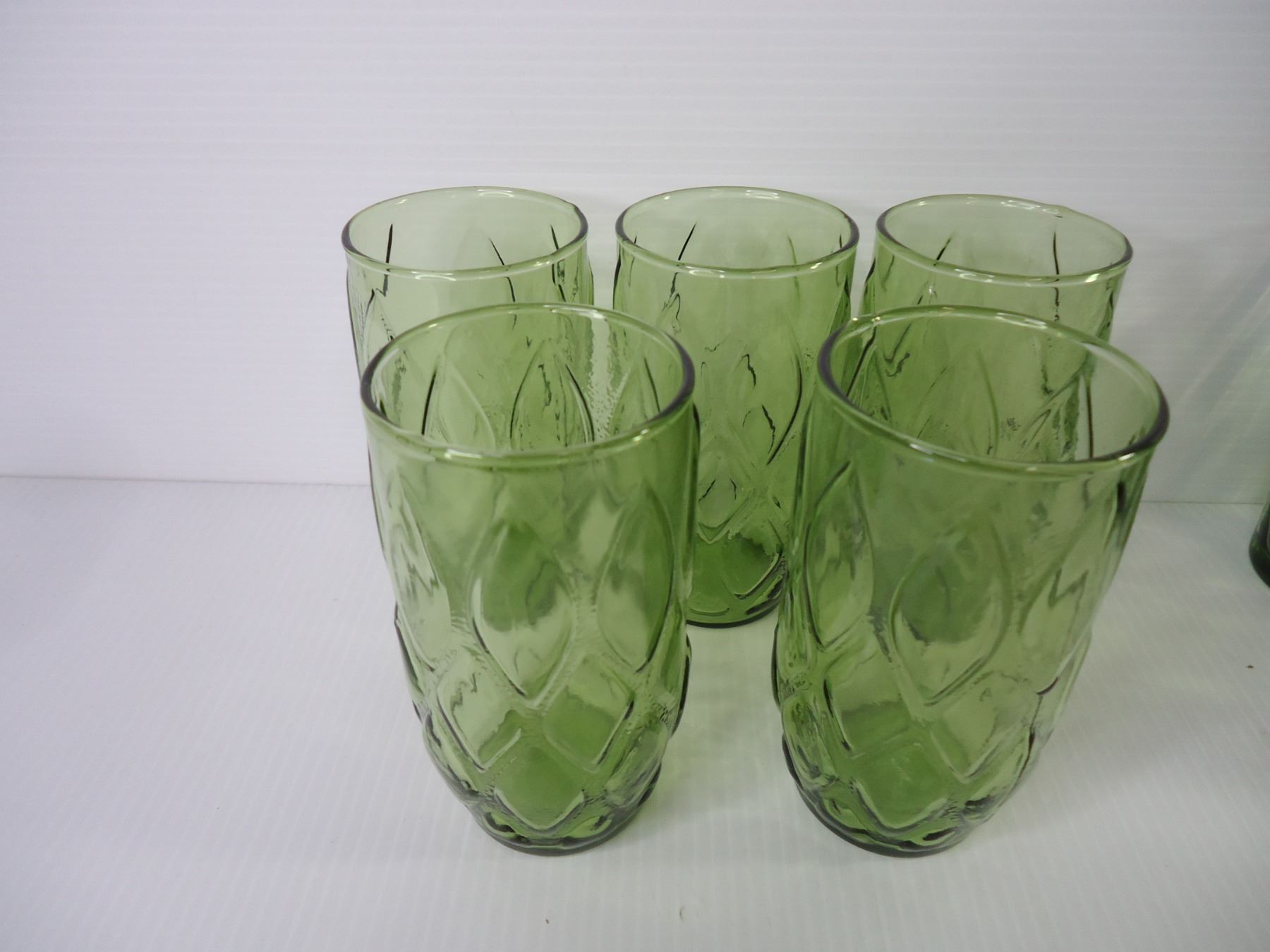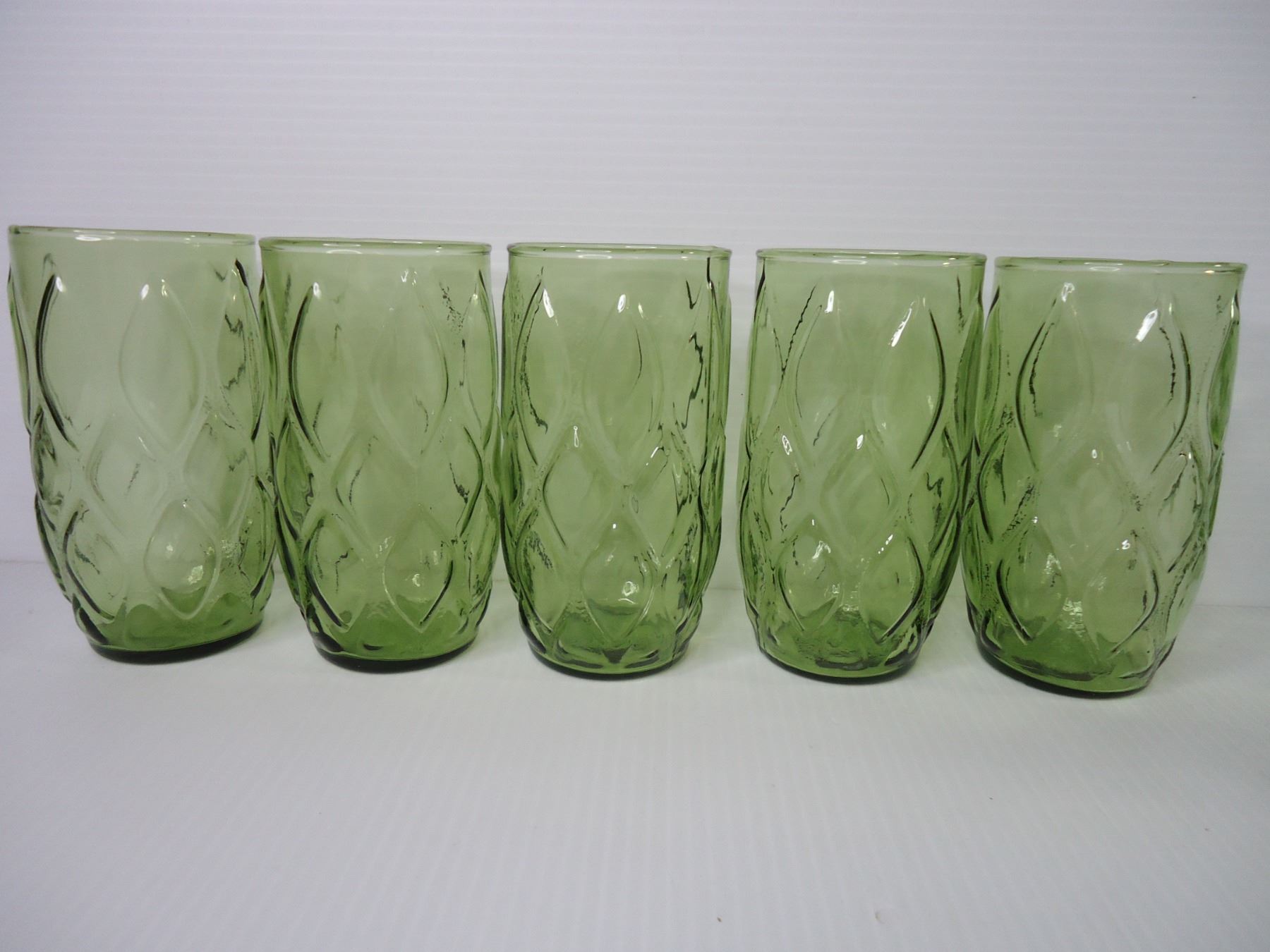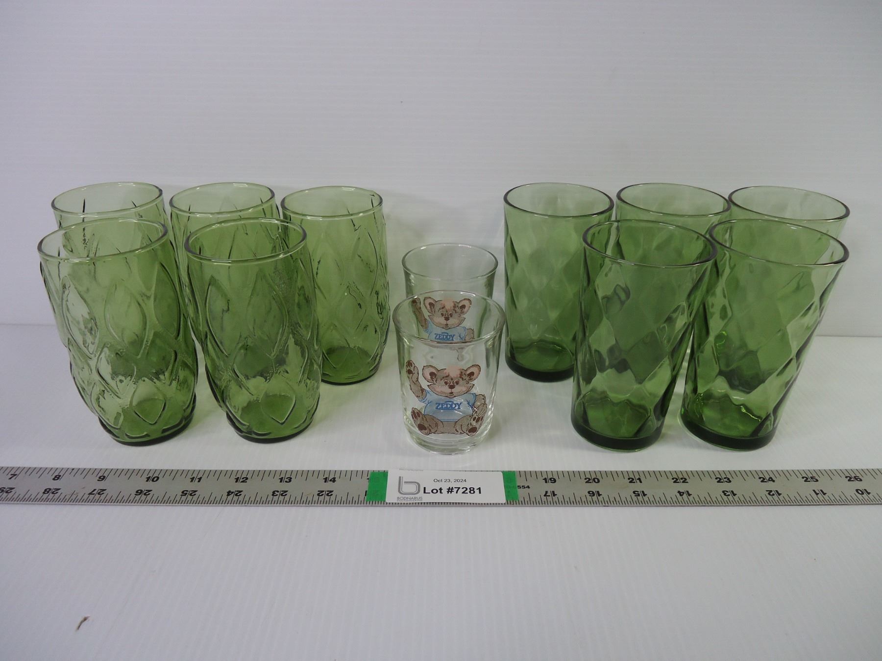 (10) Olive Colored Glasses in 2 different styles and (2) Zeddy Children Juice Glasses