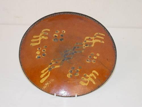 10" PA REDWARE PLATE W/ YELLOW SLIP DECORATION - SURFACE WEAR & LOSSES, 4" HAIRLINE;