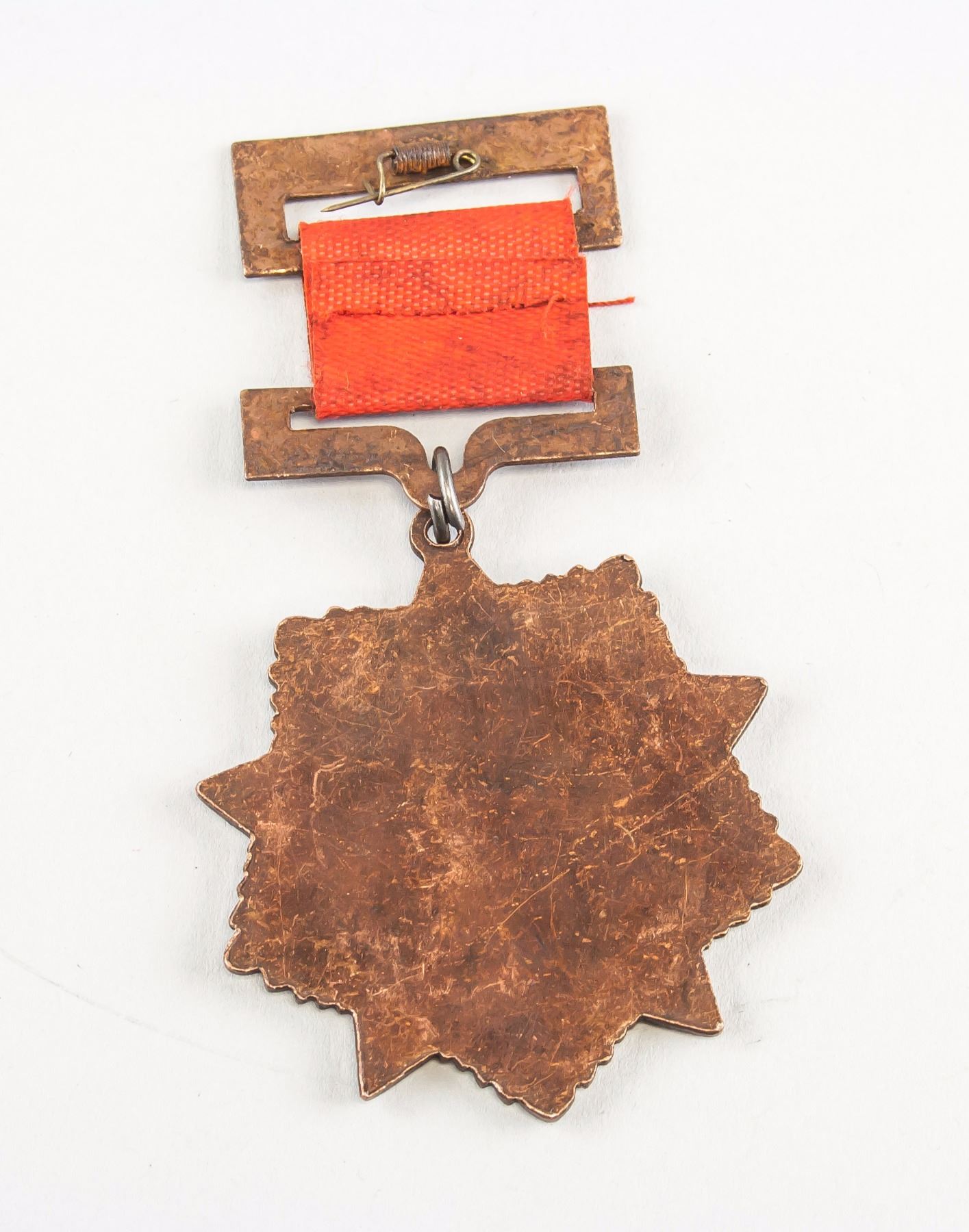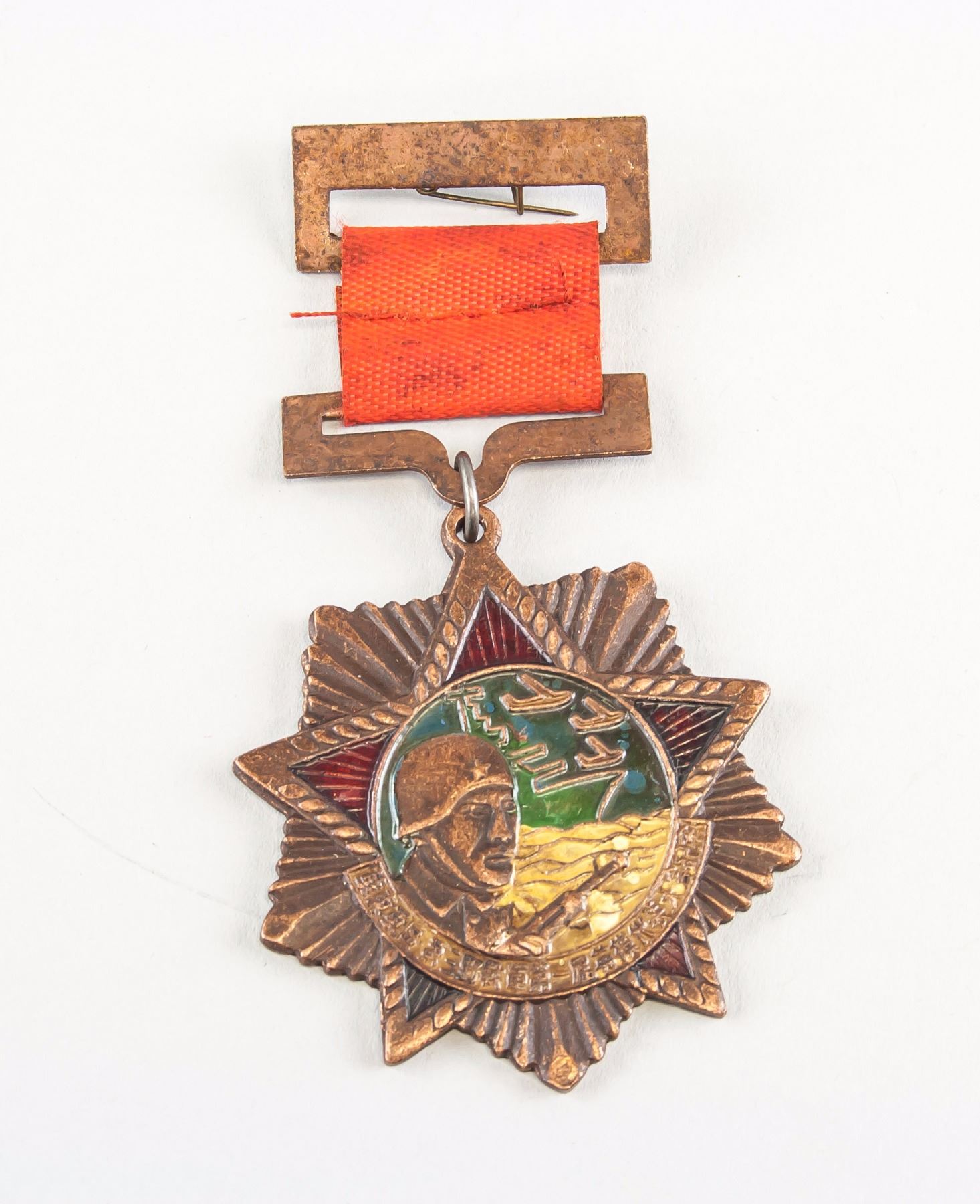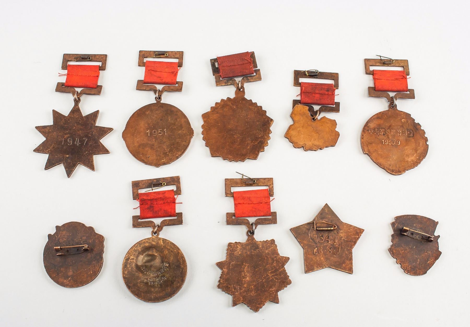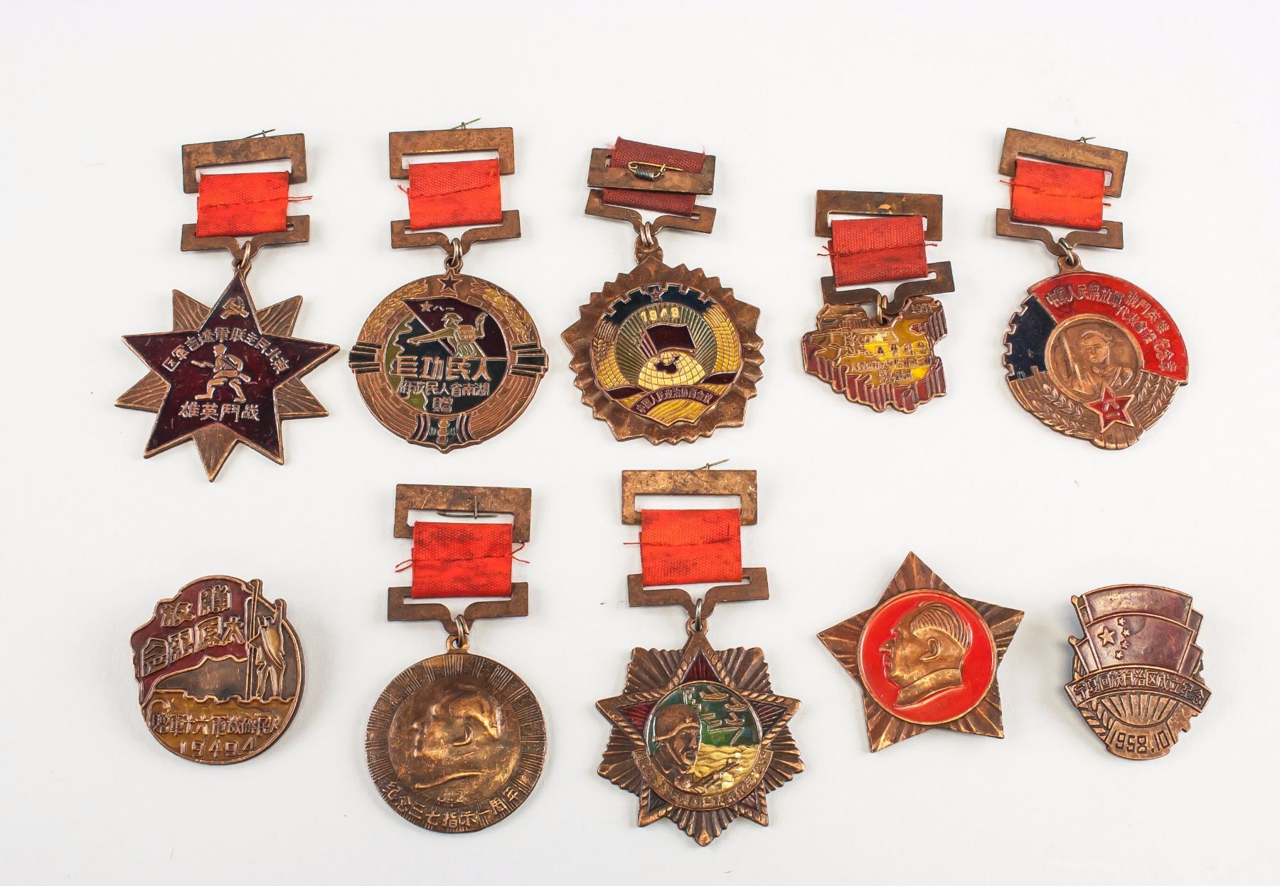 10 pieces of assorted Chinese medals; script on medal is as follows: Northeast Democratic Army Liaoji Area Combat Hero medal; Hunan Province People Hero medal; 1949 CPPCC medal; 1951 People's Liberation Army medal; PLA Combat Hero medal; 1949 Taiyuan LIberation medal; 1968 Sanqi Instruction Commemorative medal; PLA Third Field Army Hero medal; Chairman Mao medal; 1958 Ningxia Autonomous Region Commemorative medal; 5 cm x 4.7 cm, 25 grams