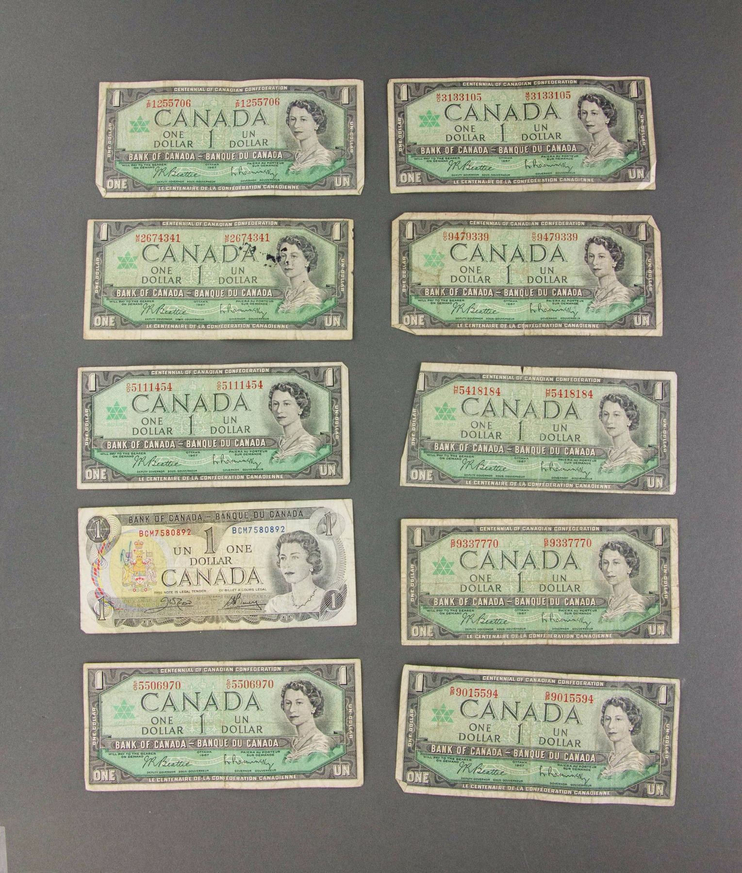 Ten pieces of Canadian one dollar paper bill; of nine pieces of 1967 and one piece of 1978; both obverse show portrait of Elizabeth II, and reverse show the original Parliament Buildings; 7 cm x 15.5 cm