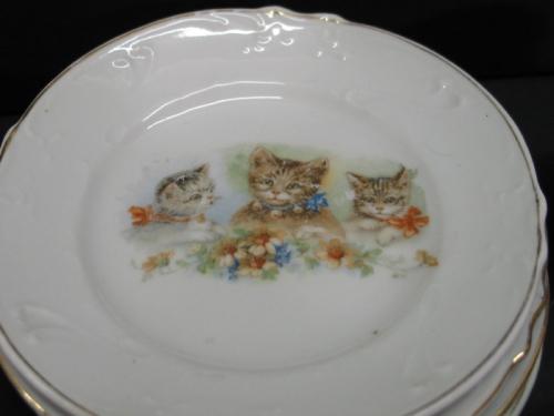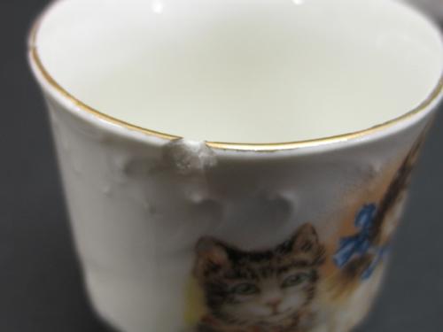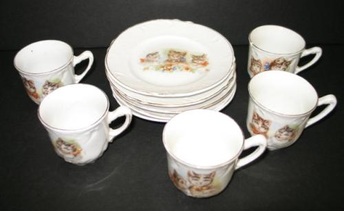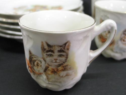 10 PIECE PORCELAIN CHILD’S SET. Consists of 5 cups & saucers. Decorated with kittens. No mark. Two cups have a chip along top of rim. Loss to gilt on all pieces.