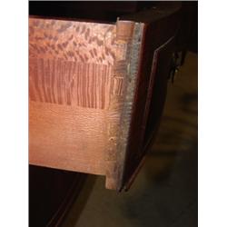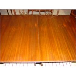 10 PIECE VAN SCIVER FLAME MAHOGANY DININGROOM SUITE. Consists of 6 shield back dining chairs (5 side chairs and 1 arm chair) (39.5" H to top of back, 22" W, 18" H to top of seat), double pedestal dining table (63.5" L, 42" W, 30" H), sideboard (38" H, 69.5" W, 17" D), server with one drawer over two doors (35" H, 38.5" W, 18" D), and china hutch with two glass doors on top (78.5" H, 38.5" W, 18" D). Sideboard, server, & china hutch are decorated with ornate bellflower inlay. China hutch has broken arch top with finial. Excellent condition.