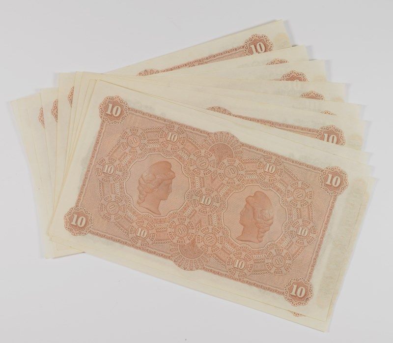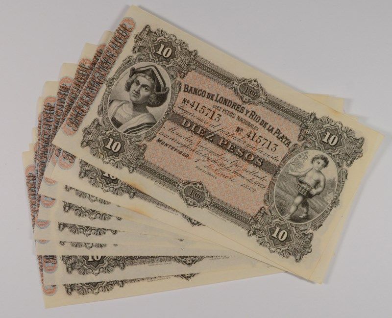 ( 10 ) PCS UNCIRCULATED 1883 URUGUAY 10 PESOS NOTES, RARE!!