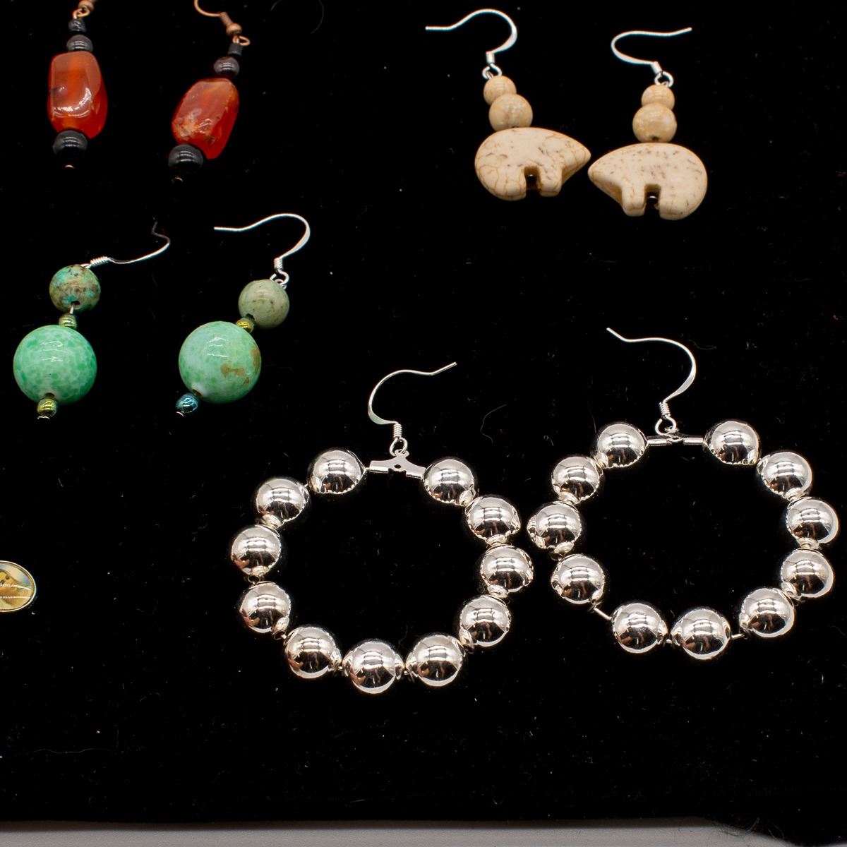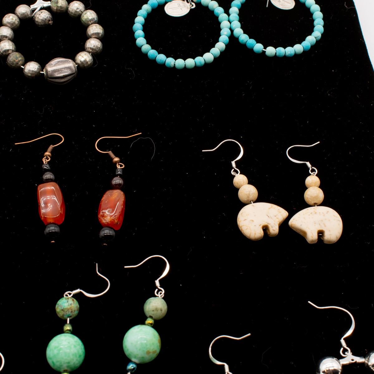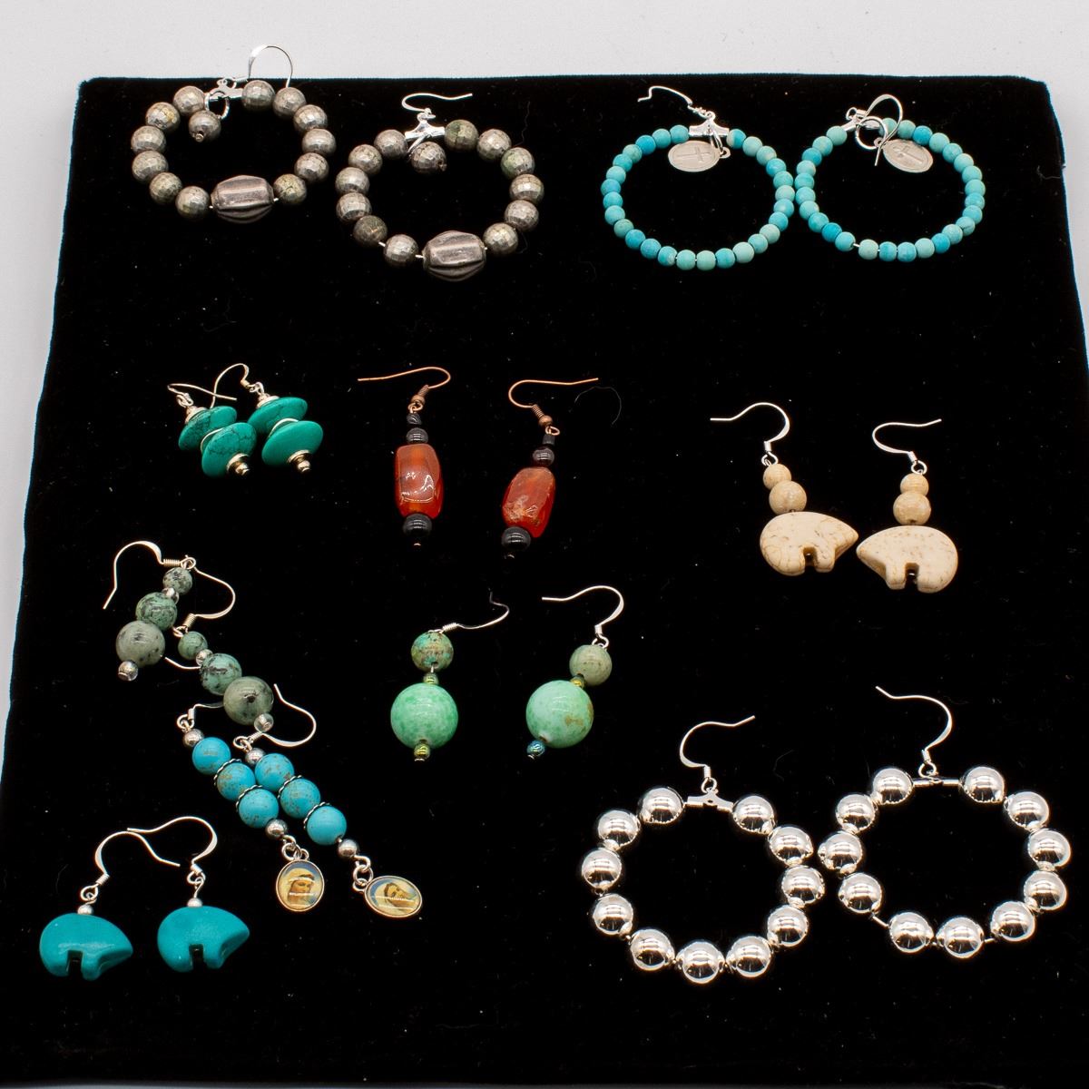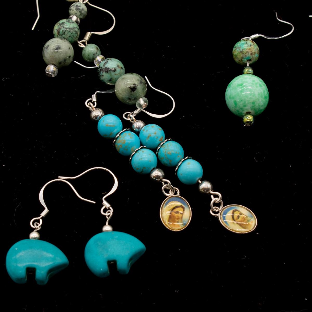 10 Pairs of Assorted Earrings, lot composed of silver bead hoops, sterling plate bead hoops, turquoise magnesite hoops, turquoise magnesite and picture jasper bear fetishes, African turquoise, turquoise magnesite dangles with Catholic charms, green turquoise discs, and fire agate and onyx (copper wires), longest pair measures 2.5''L which include the wires