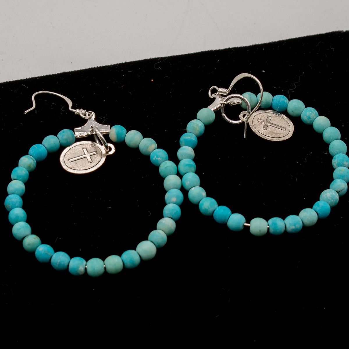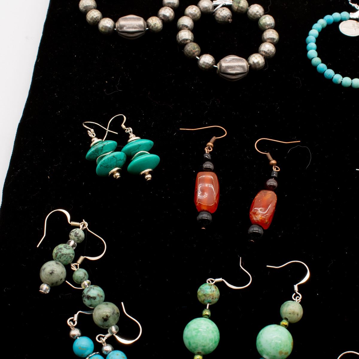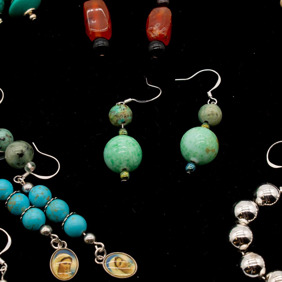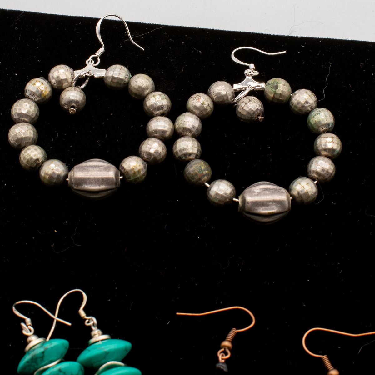 10 Pairs of Assorted Earrings, lot composed of silver bead hoops, sterling plate bead hoops, turquoise magnesite hoops, turquoise magnesite and picture jasper bear fetishes, African turquoise, turquoise magnesite dangles with Catholic charms, green turquoise discs, and fire agate and onyx (copper wires), longest pair measures 2.5''L which include the wires