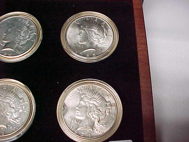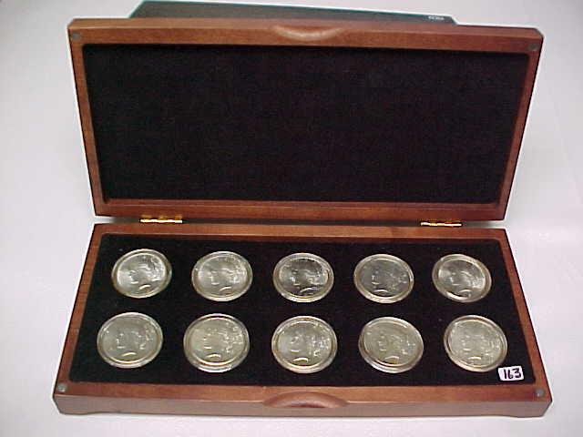 Wood Box with 10 Peace $: 1922 Unc, 1923 Unc, 24 BU, 24S AU bag marks, 25 Unc, 26 AU, 26S AU gouges, 27 Unc toned, 28S VG, 34D EF toned