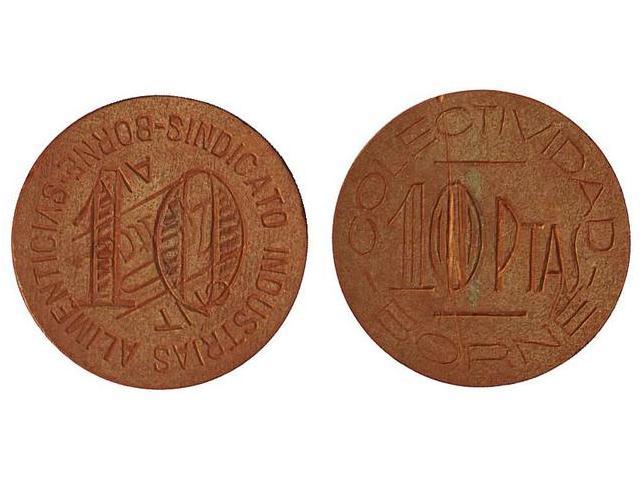 10 Pesetas. Guerra Civil. SINDICATO INDUSTRIAS ALIMENTICIAS C.N.T.-A.I.T. - COLECTIVIDAD BORNE. BARCELONA. Cartón cuero. (Rayitas). RARA. L-1145. EBC-.