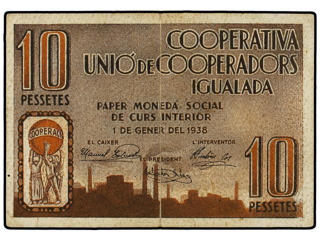 10 Pessetes. 1 Gener 1938. COOPERATIVA UNIÓ DE COOPERADORS. IGUALADA. Cartulina. Números más pequeños y seguidos de asterisco. (Algo sucio). L-3251u. MBC+.