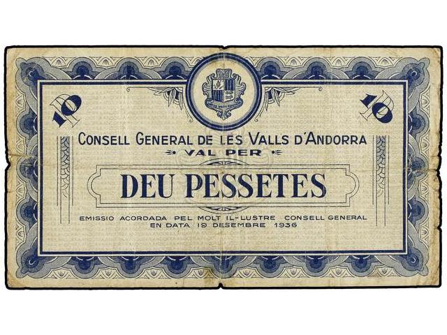 10 Pessetes. 19 Desembre 1936. CONSELL GENERAL DE LES VALLS D´ANDORRA. Azul (Pequeñas roturas). Ed-AND8. MBC-.