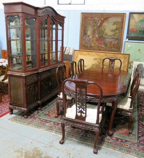 Including table with two leaves, 8 chairs (2 arm, 6 side), & a two piece break front.