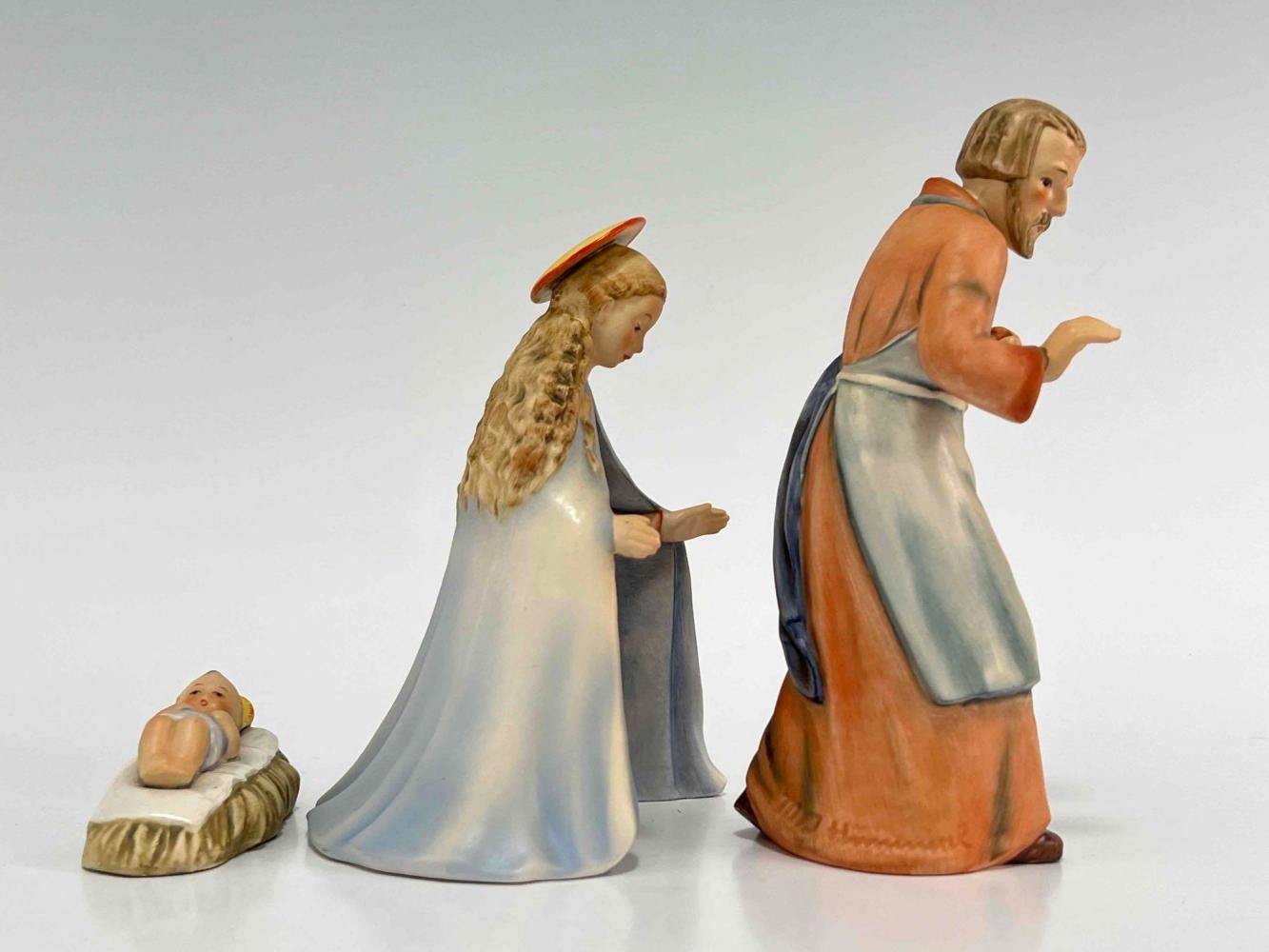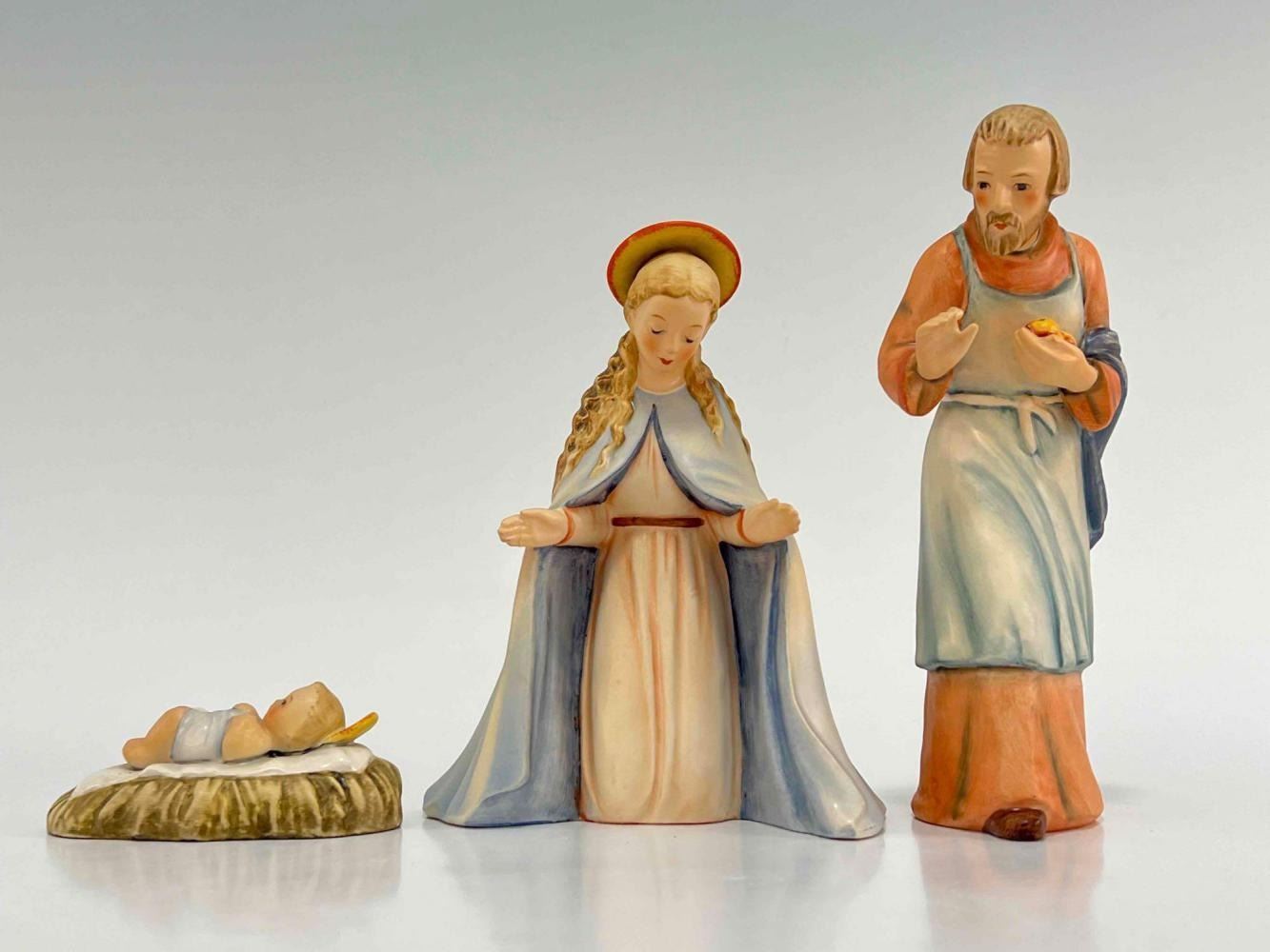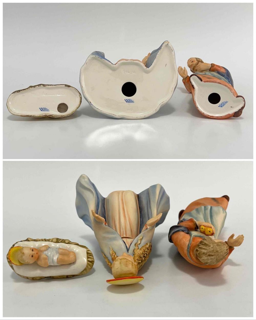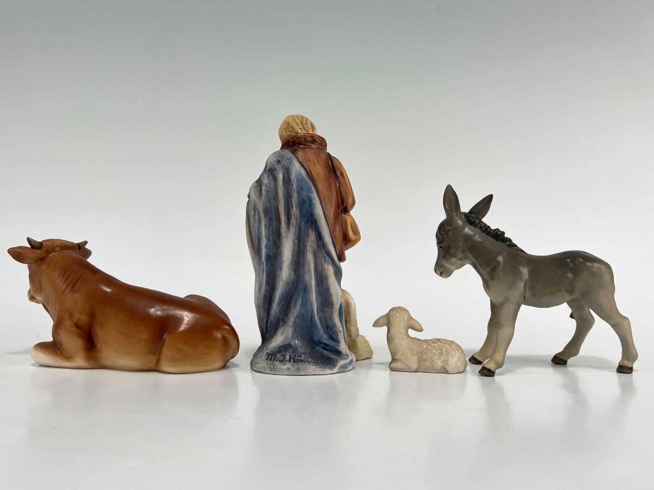 10 Piece Goebel Nativity Scene. Marked M.I. Hummel, W. Goebel W. Germany 214/A 1951. Largest Piece Approximately 7.0H x 3.5W x 3.375D in. Smallest Approximately 2.375L x 1.75H x 1.25D in.